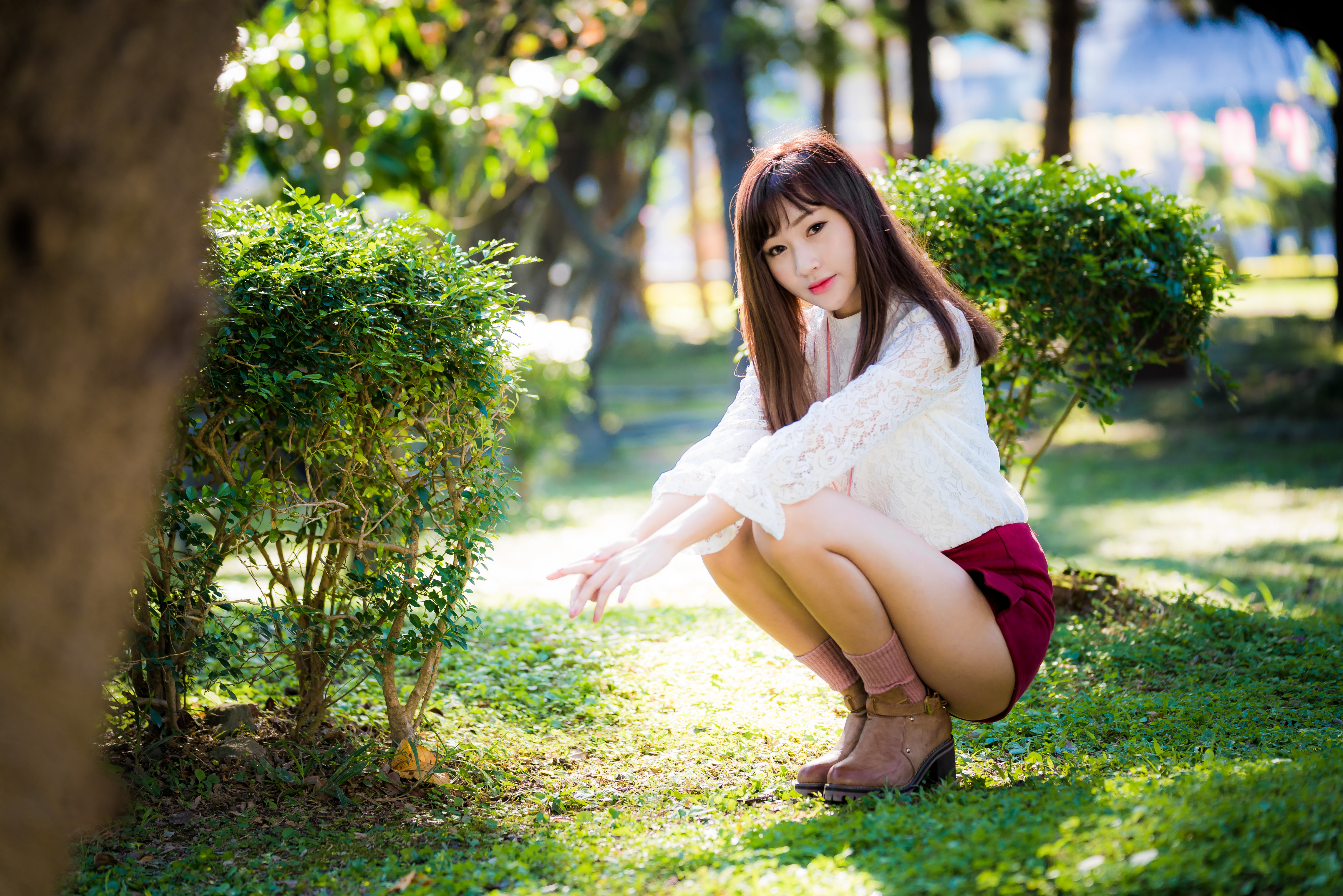 Обои: Девушка азиатка сидит на корточках в парке