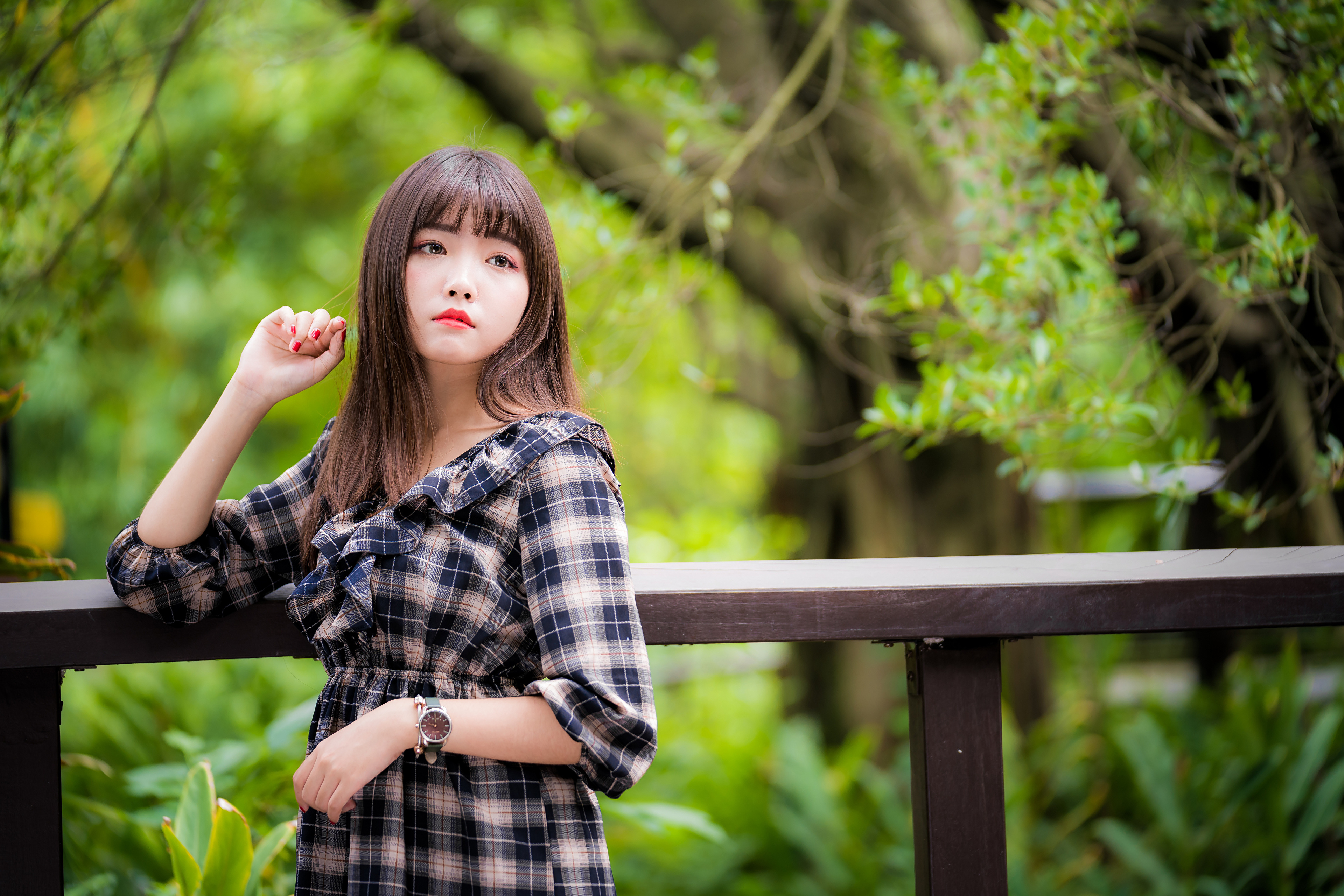 Девушка азиатка в платье в клеточку - 3840x2561
