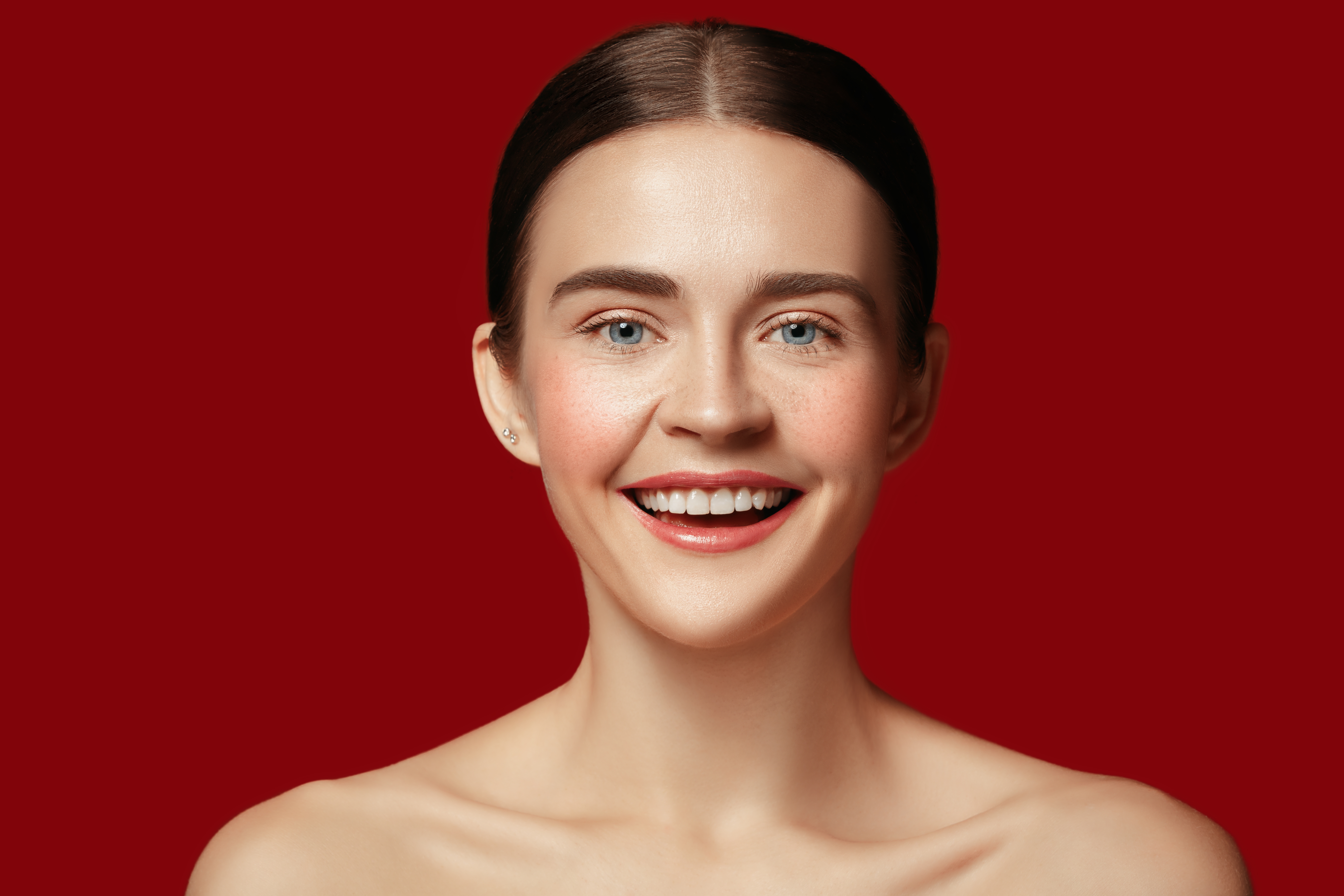 Улыбающаяся молодая девушка на красном фоне - 7900x5267