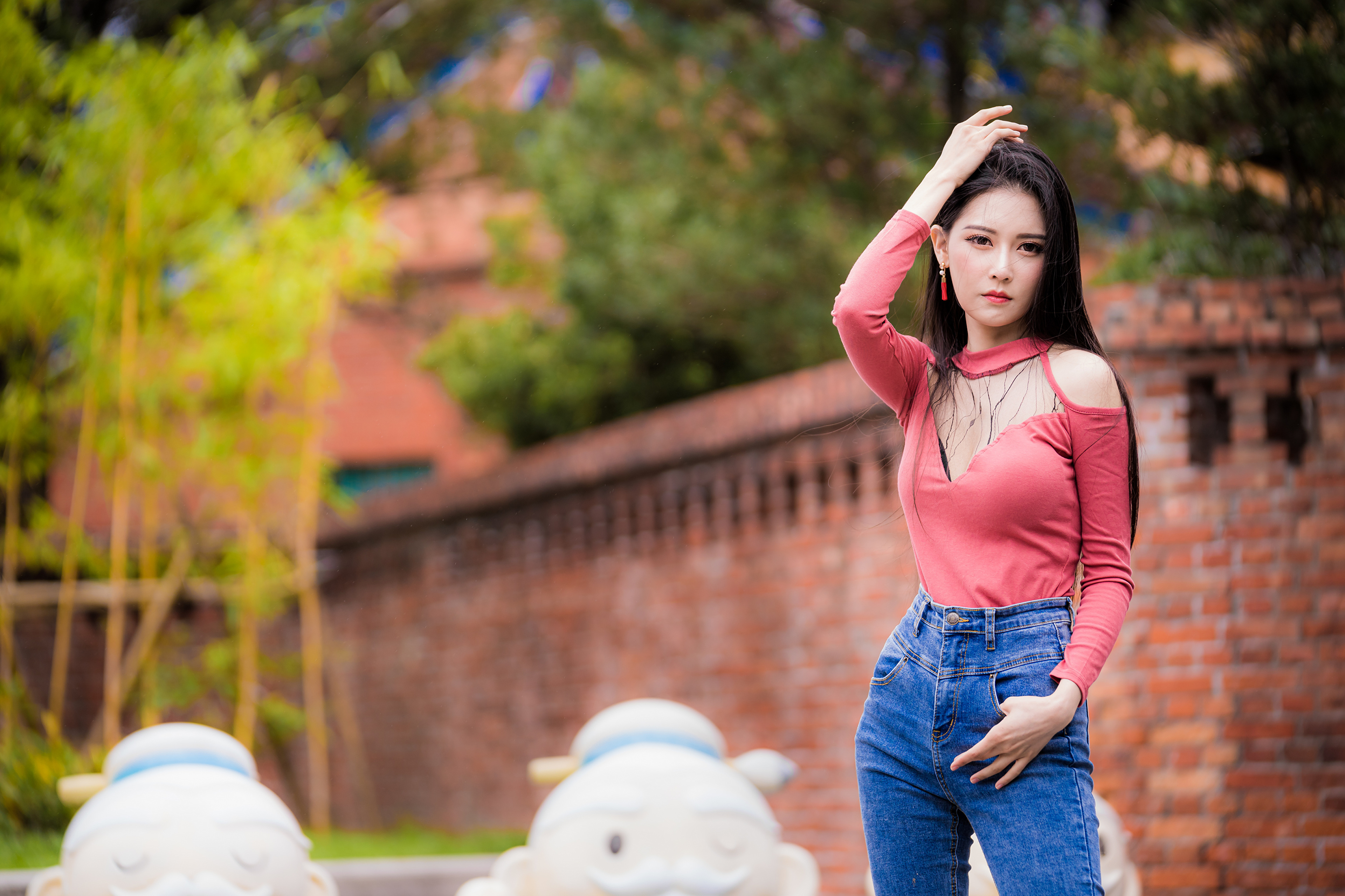Красивая девушка азиатка в красном кимоно с палочкой в руке