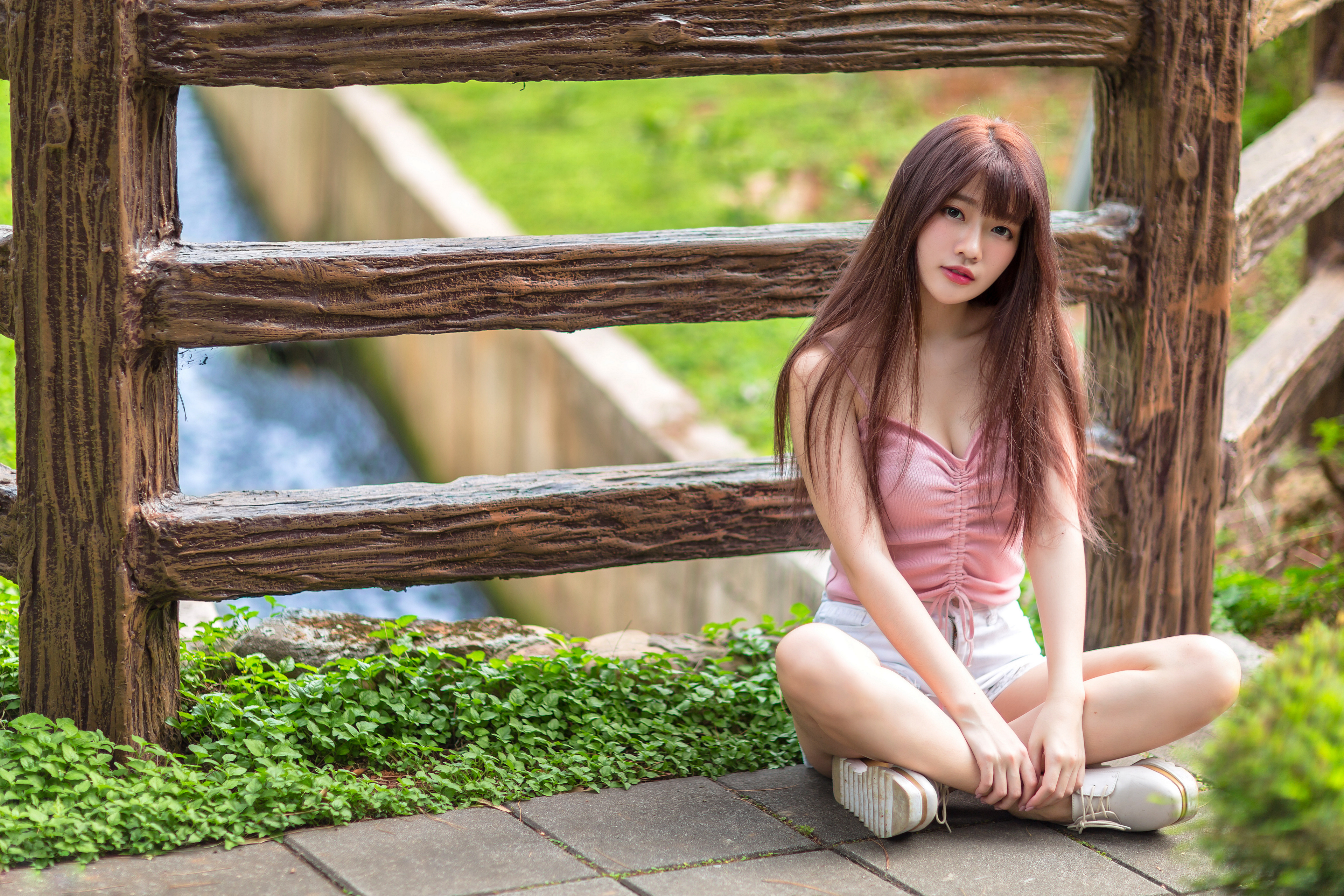 Длинноволосая азиатка сидит у забора - 3840x2560