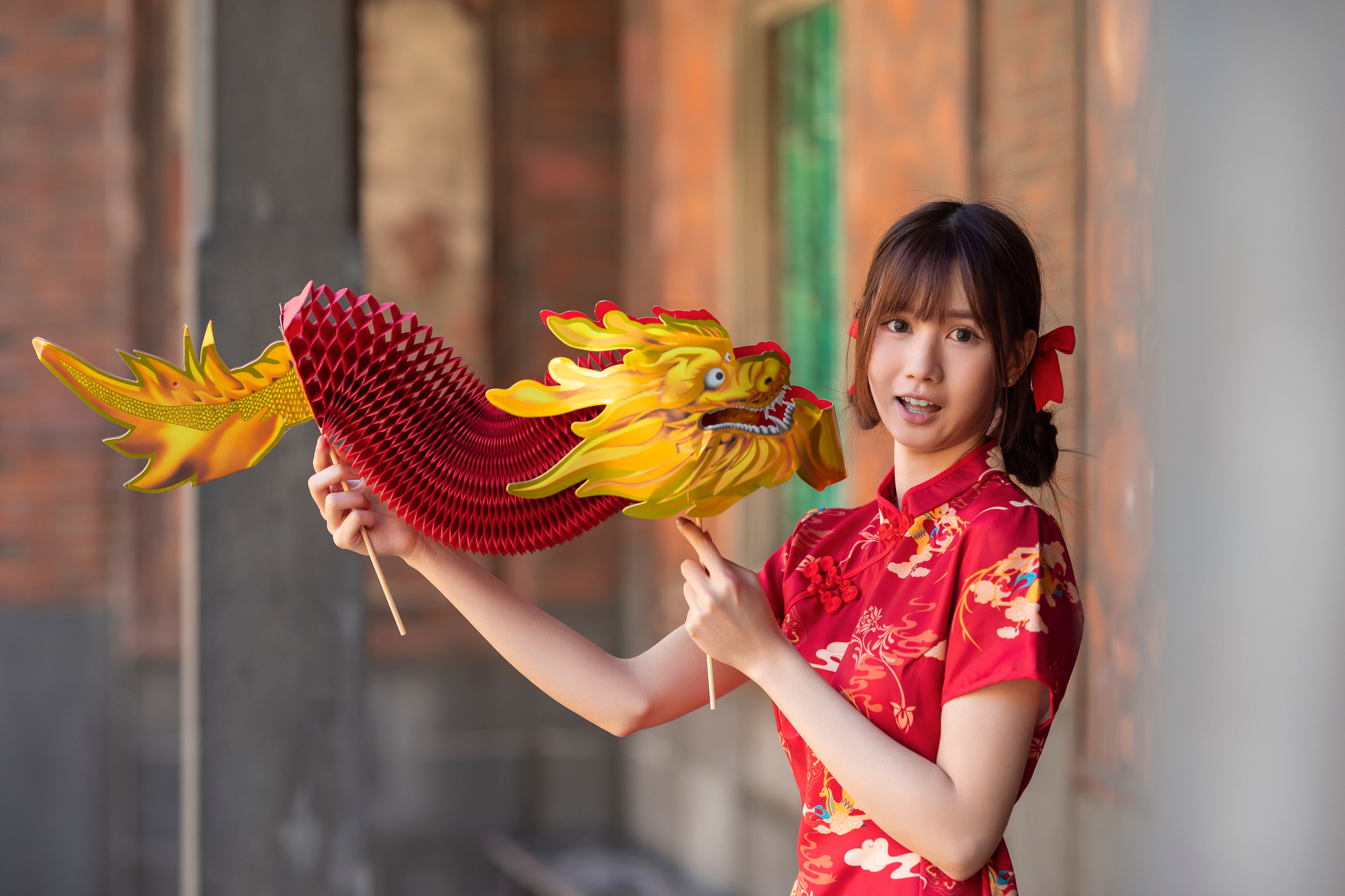 Красивая девушка азиатка в красном кимоно с палочкой в руке