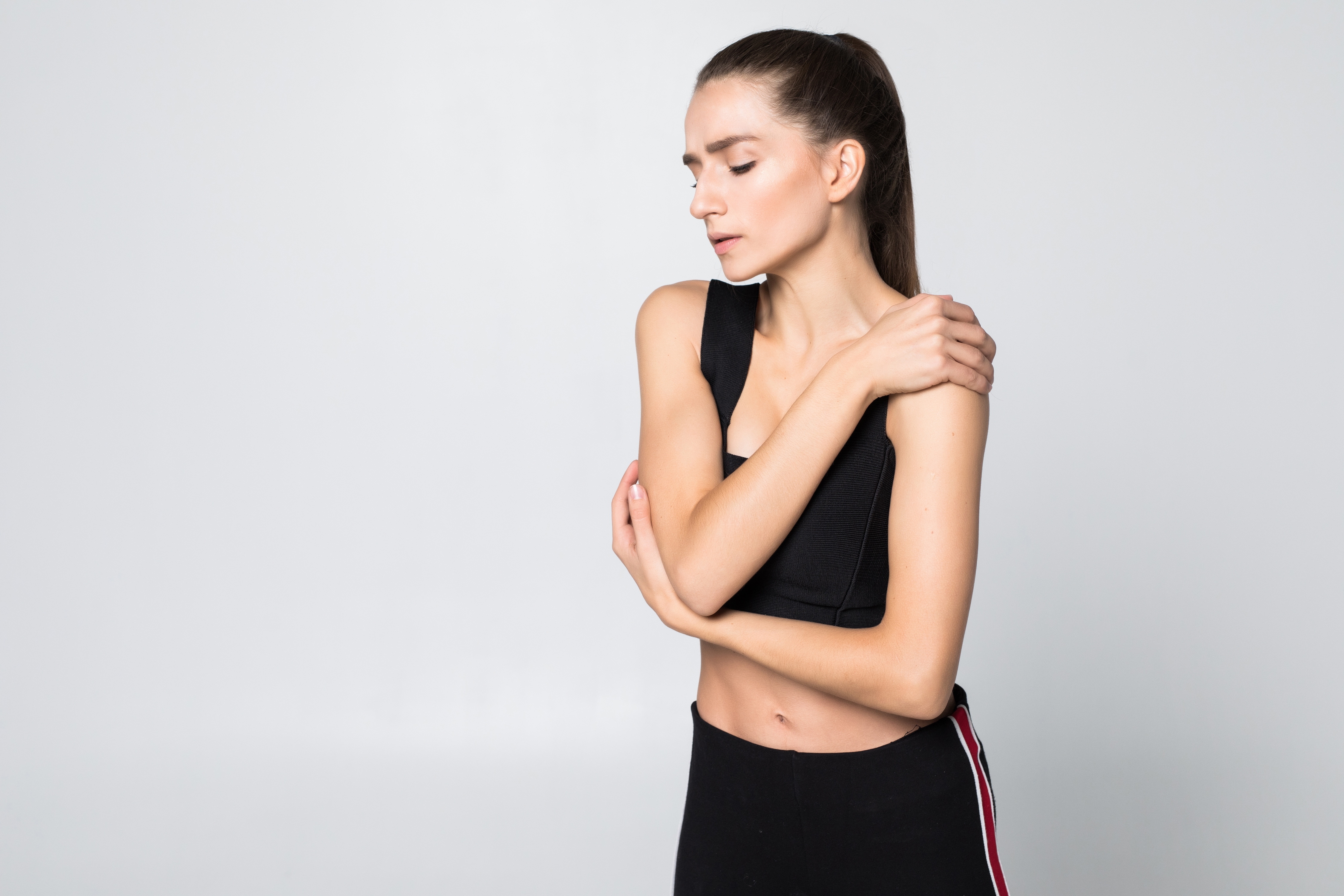 Скромная спортивная девушка на сером фоне - 4500x3000