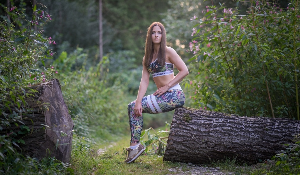 Спортивная девушка сидит на бревне Обои для рабочего стола 1024x600