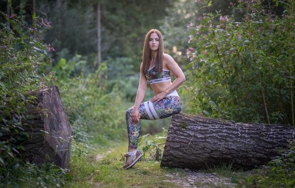 Спортивная девушка сидит на бревне Обои для рабочего стола 600x382