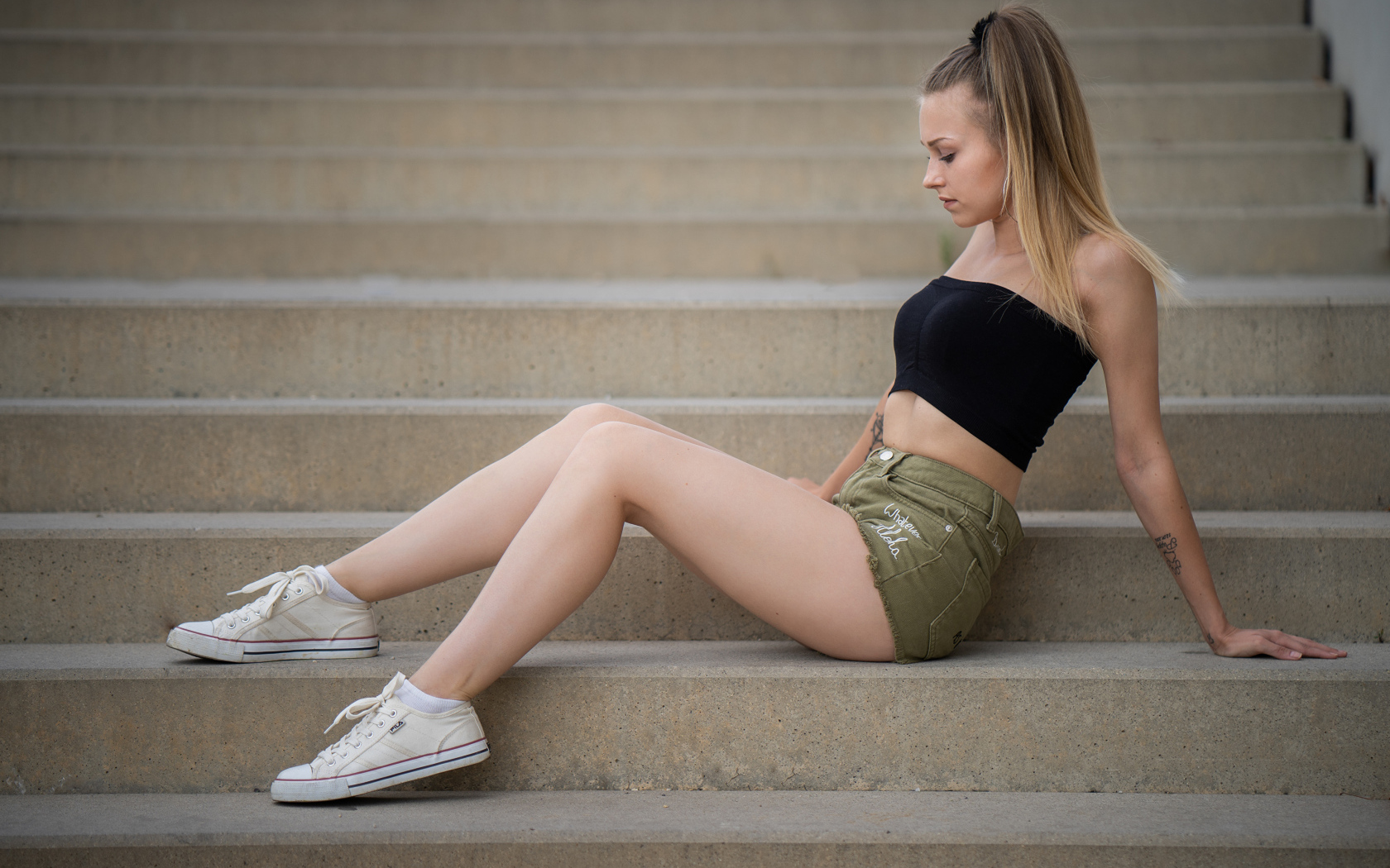 Стройная спортивная девушка сидит на ступеньках - 3840x2560