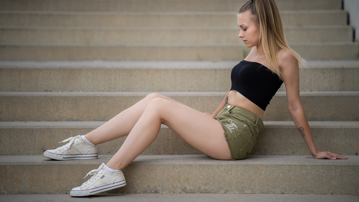 Стройная спортивная девушка сидит на ступеньках Обои для рабочего стола 1366x768