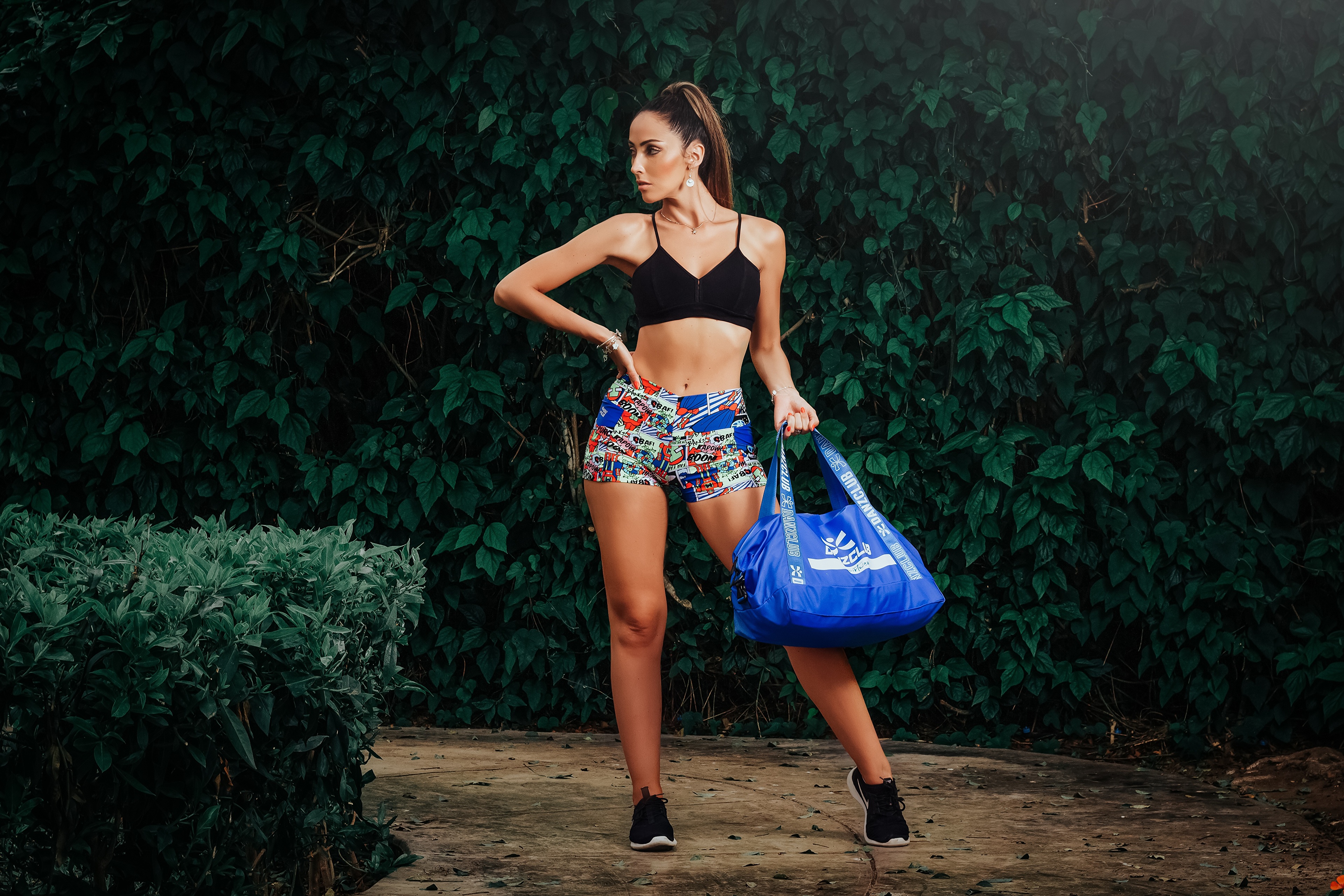 Улыбающаяся девушка в спортивной форме на сером фоне