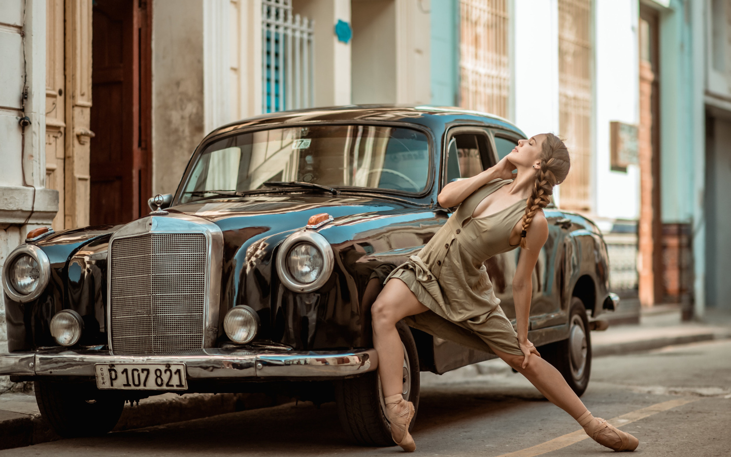 Девушка балерина стоит у старой машины Обои для рабочего стола 1440x900