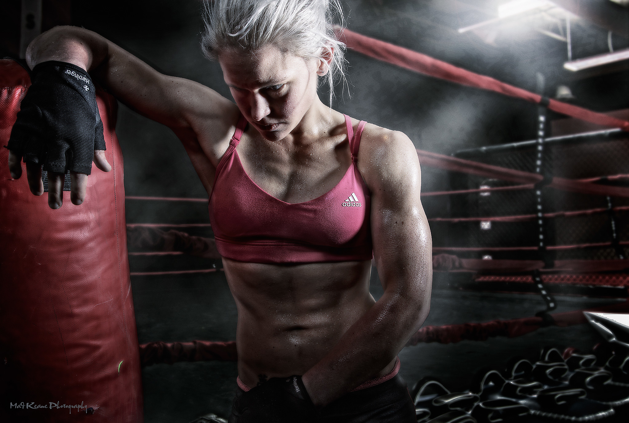 Улыбающаяся девушка в спортивной форме на сером фоне