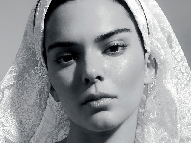 Популярная американская модель Кендалл Дженнер в свитере на белом фоне