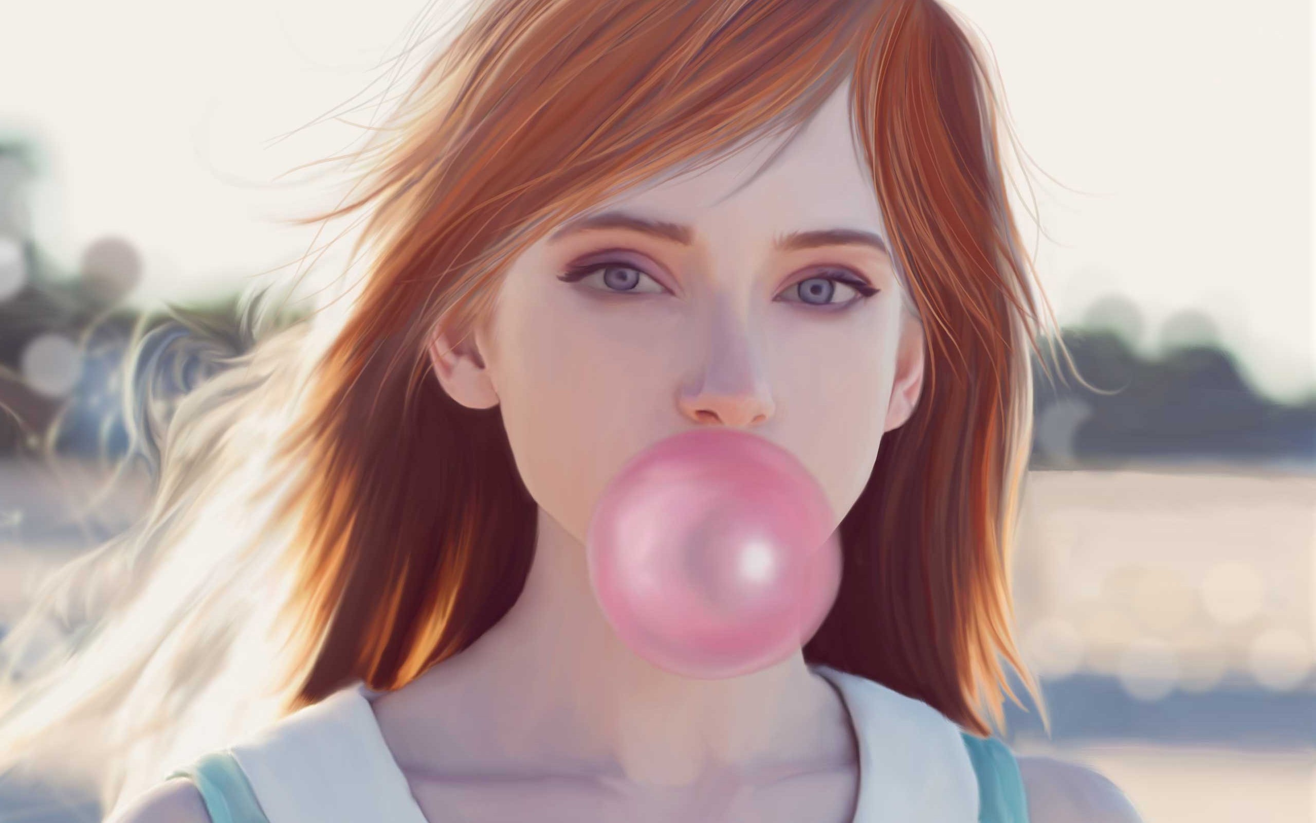 Рыжая девушка с розовой жевачкой - 2560x1600