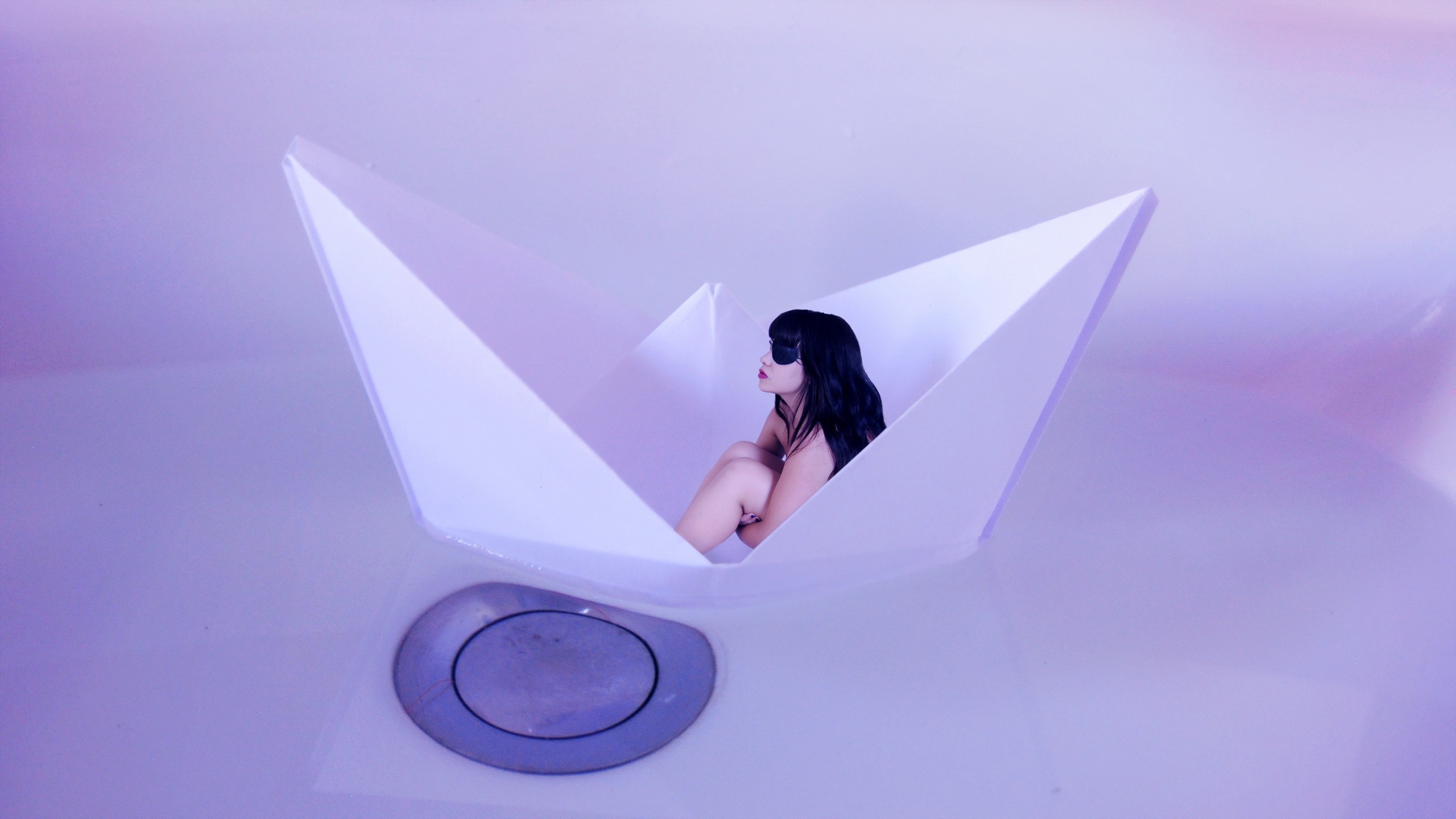 Девушка сидит в бумажном кораблике - 2560x1440
