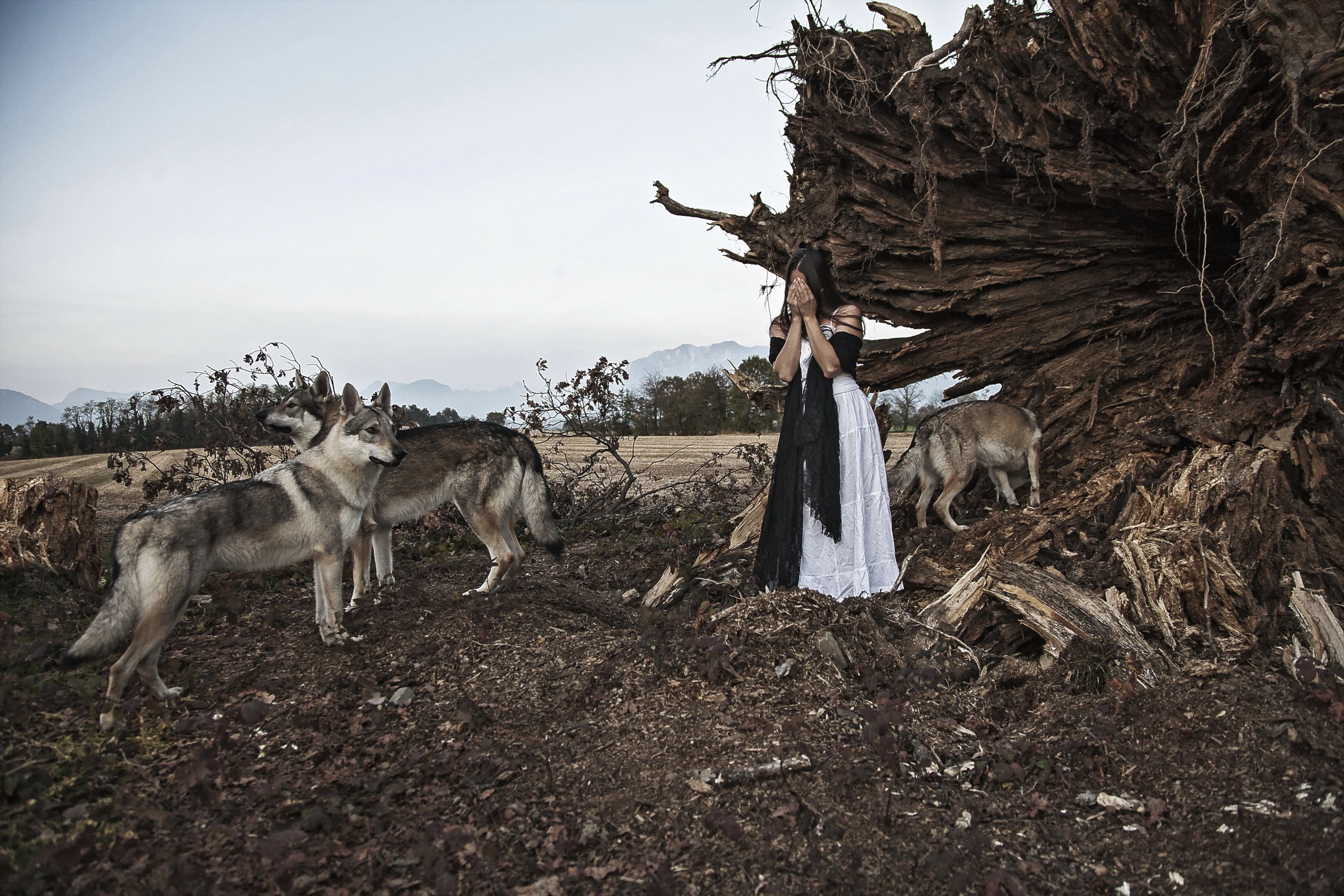 Девушка закрыла лицо в окружении волков - 2560x1707