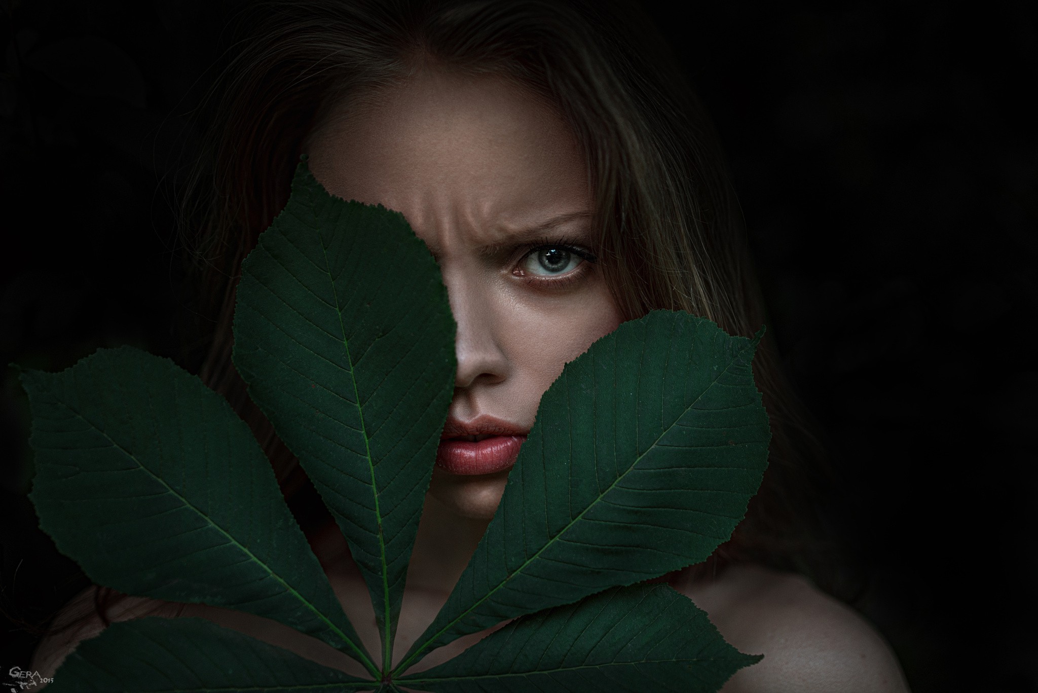 Девушка прикрыла лицо листьями каштана - 2048x1367