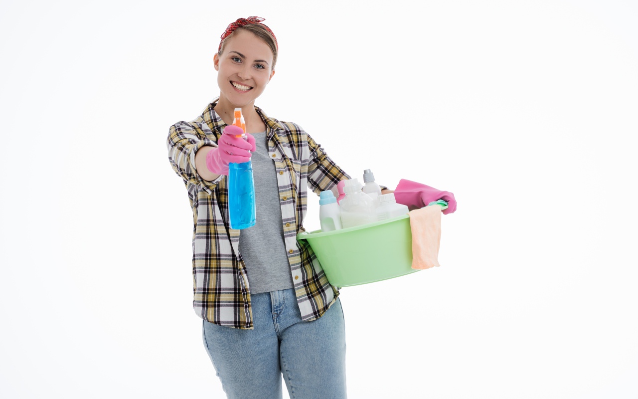Девушка домохозяйка делает уборку на белом фоне - 6240x4160