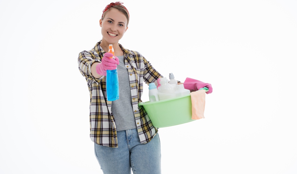 Девушка домохозяйка делает уборку на белом фоне Обои для рабочего стола 1024x600