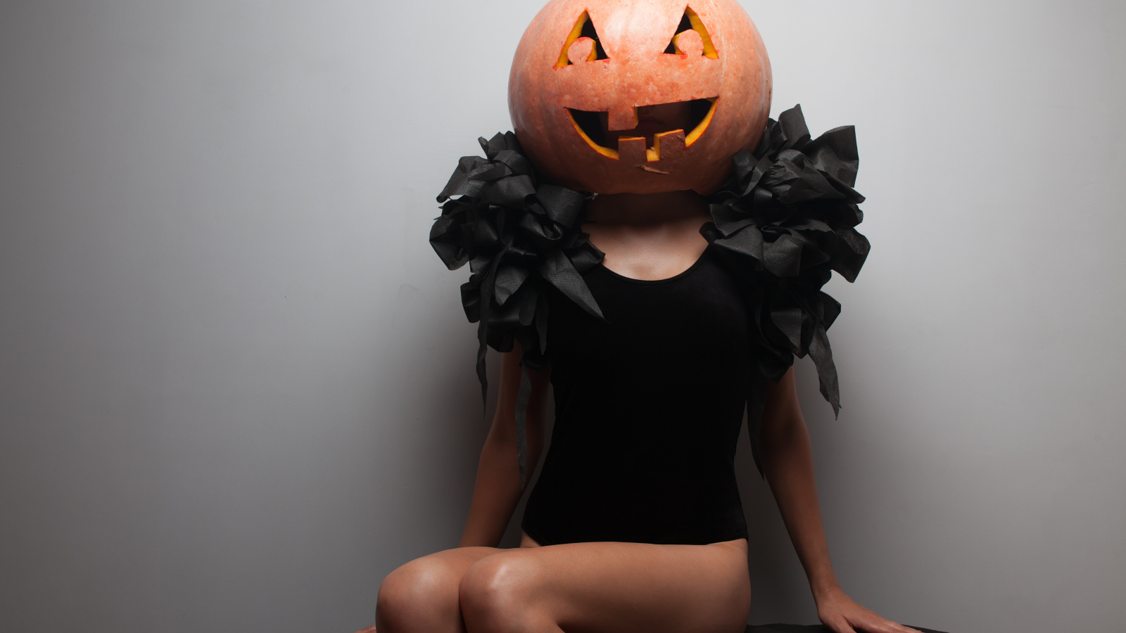 Девушка с тыквой на голове на Хэллоуин - 5616x3744