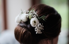 Белые цветы эустомы в свадебной прическе