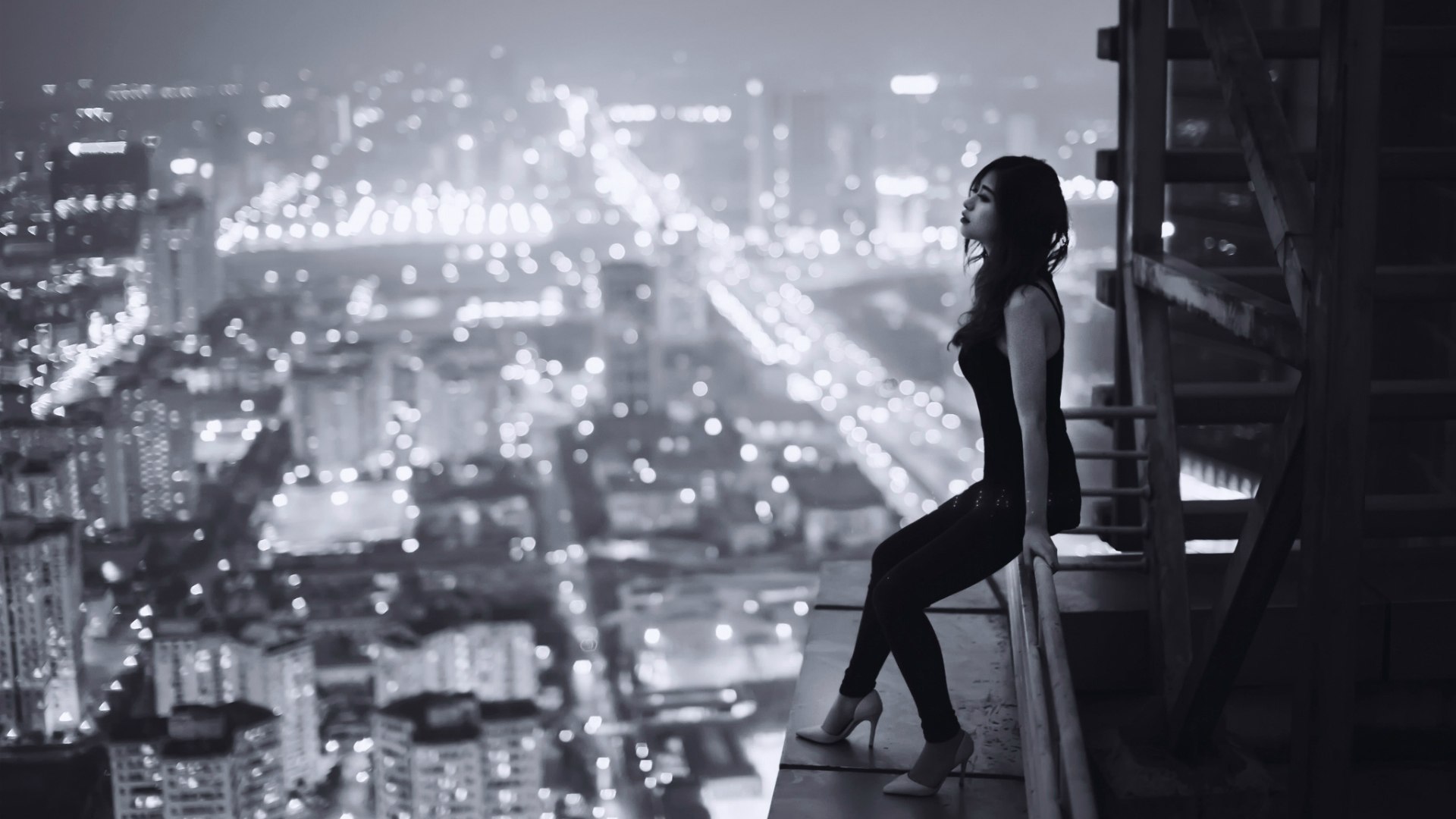 Обои: Японка смотрит на ночной Токио