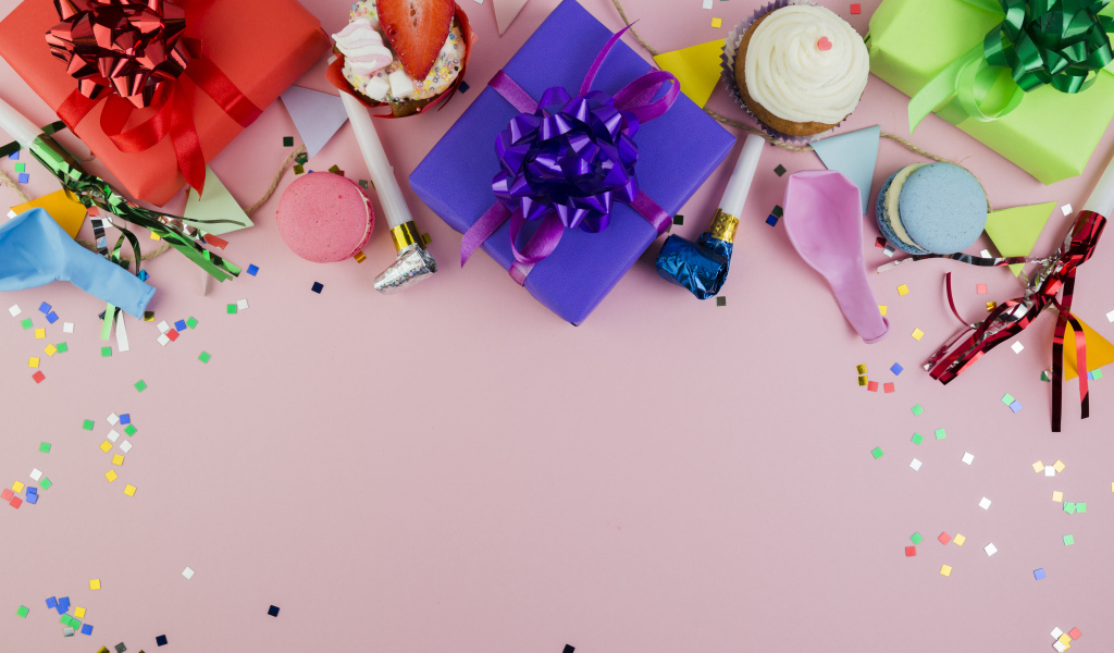 Подарки и кексы на день рождения на розовом фоне - 5760x3840