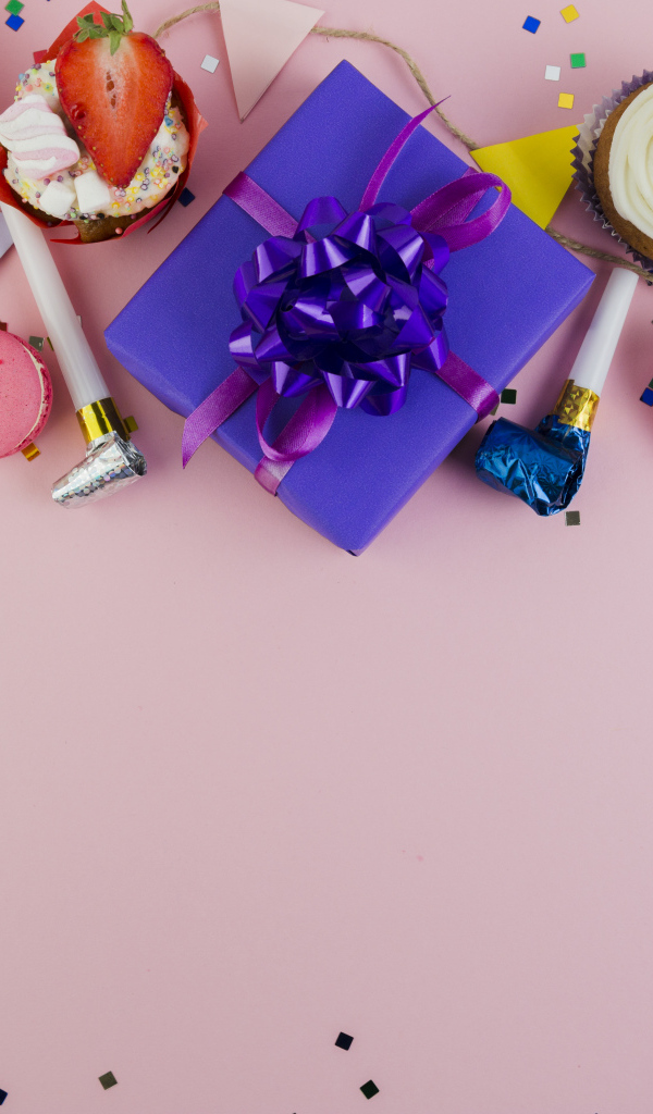 Подарки и кексы на день рождения на розовом фоне Обои для рабочего стола 600x1024