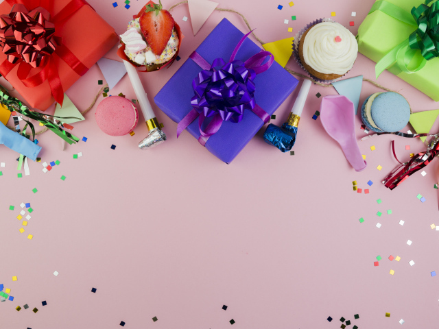Обои: Подарки и кексы на день рождения на розовом фоне