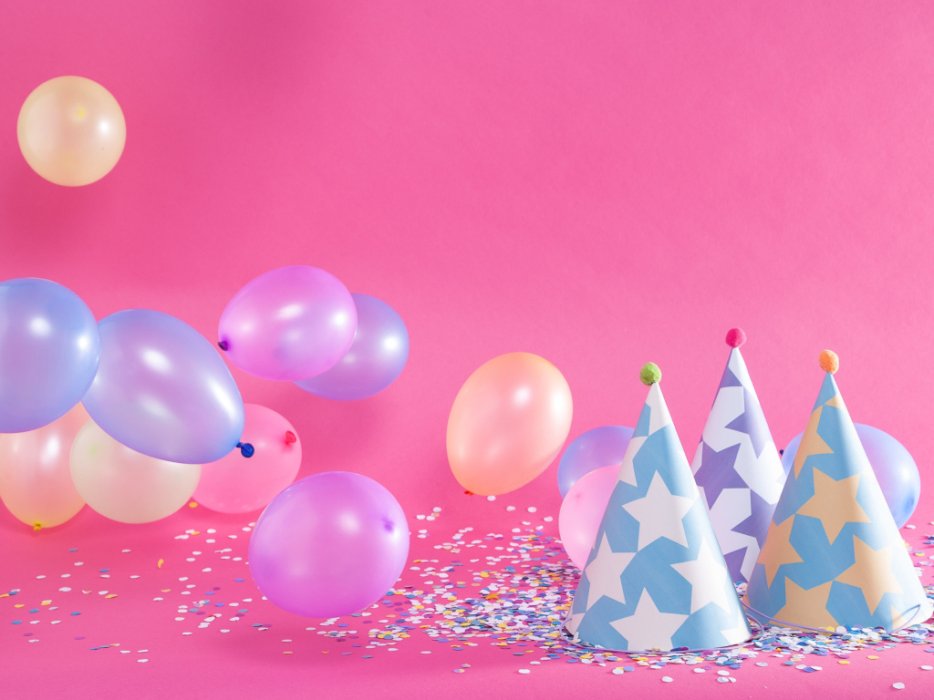 Колпаки на день рождения и шарики на розовом фоне Обои для рабочего стола 1024x768
