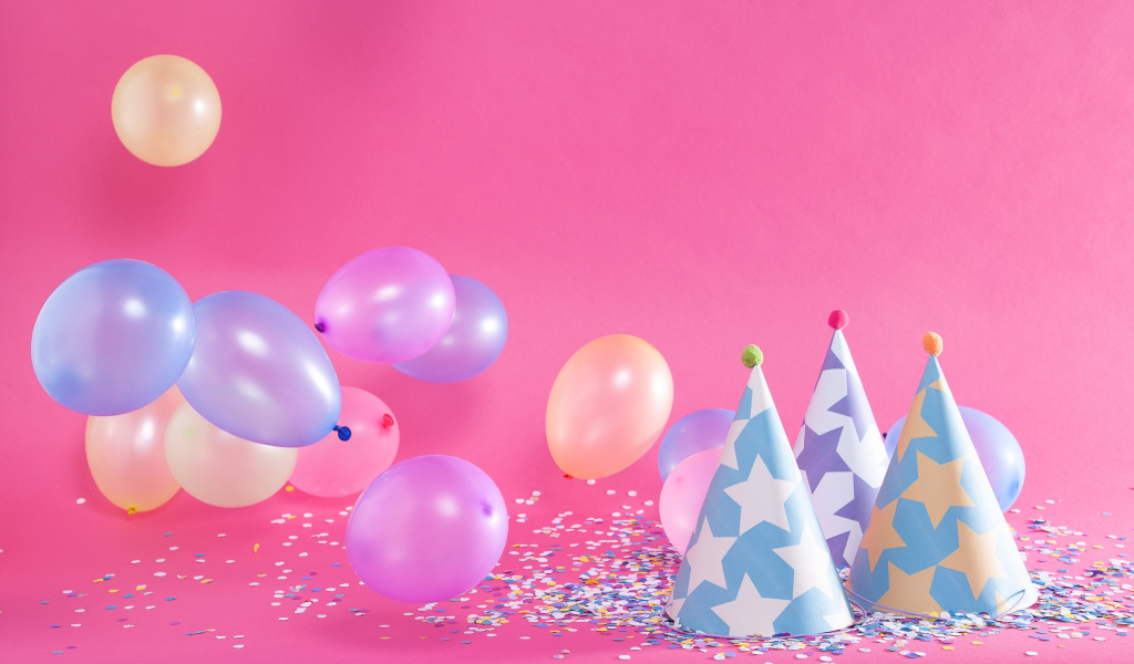 Колпаки на день рождения и шарики на розовом фоне Обои для рабочего стола 1024x600