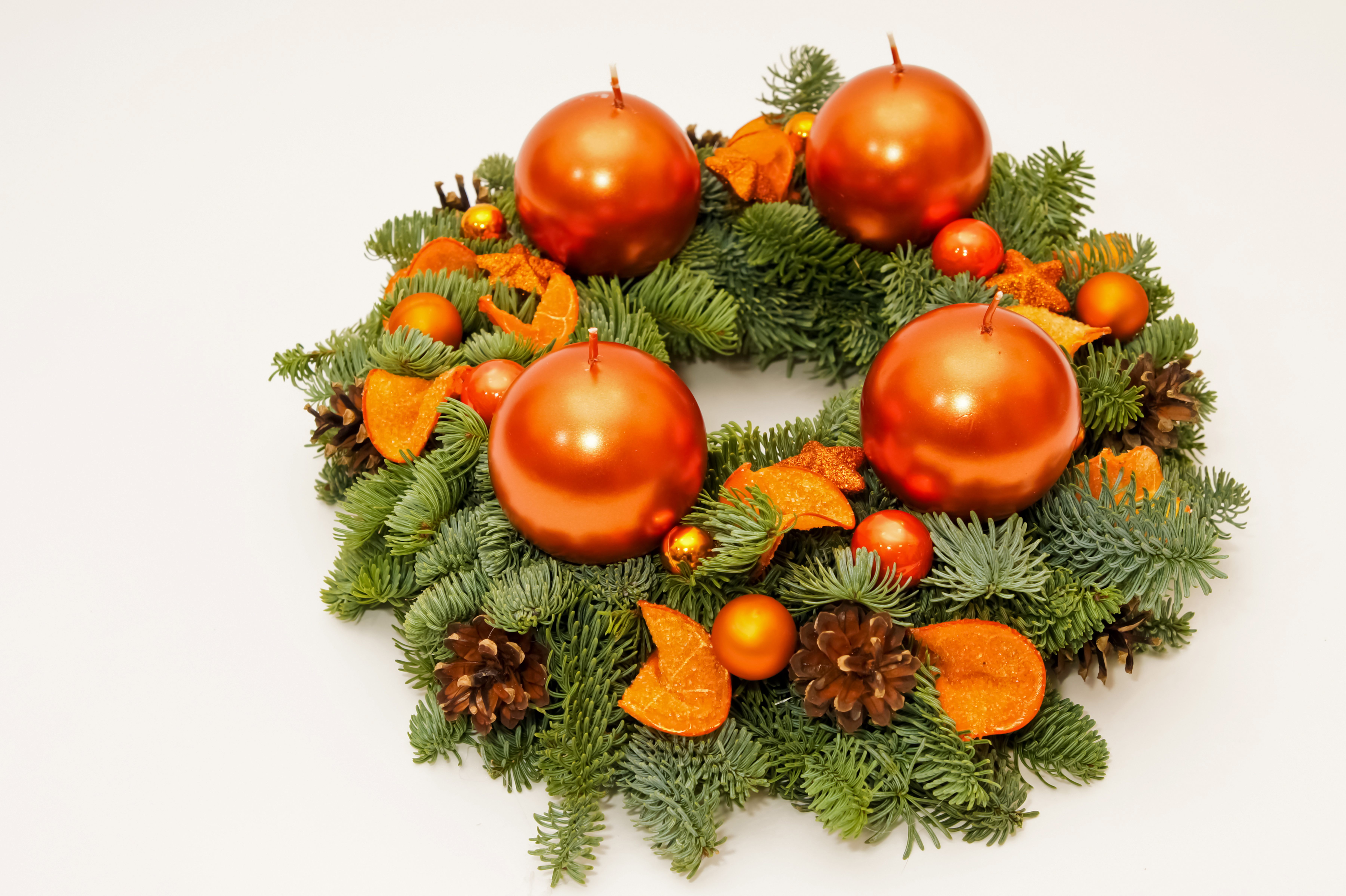Рождественский венок из еловых ветвей со свечами - 7200x4792