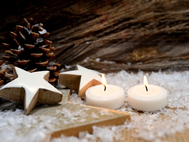 Обои: Две зажженные свечи, шишки и звезды