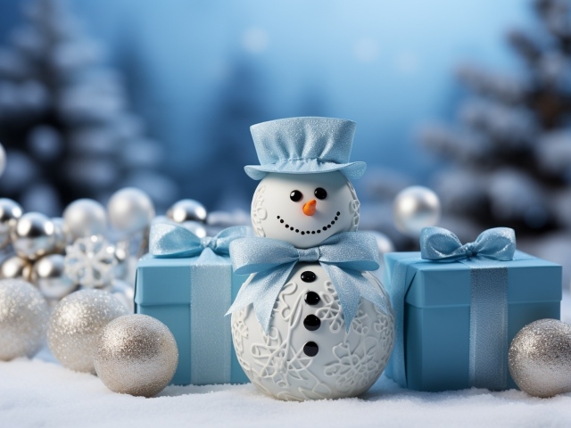 Обои: Снеговик с подарками и еловыми игрушками на Рождество