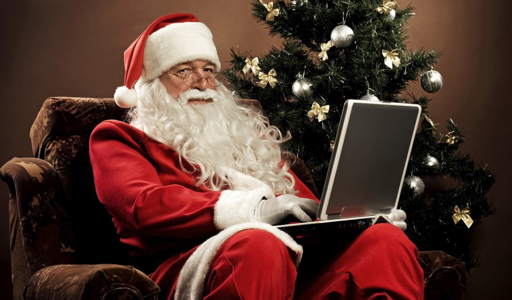 Дед Мороз с ноутбуком Обои для рабочего стола 1024x600