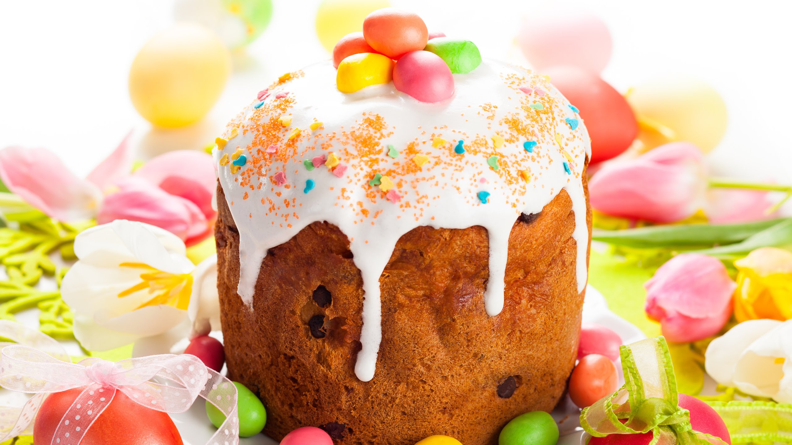 Аппетитный пасхальный кулич с яйцами на сером фоне