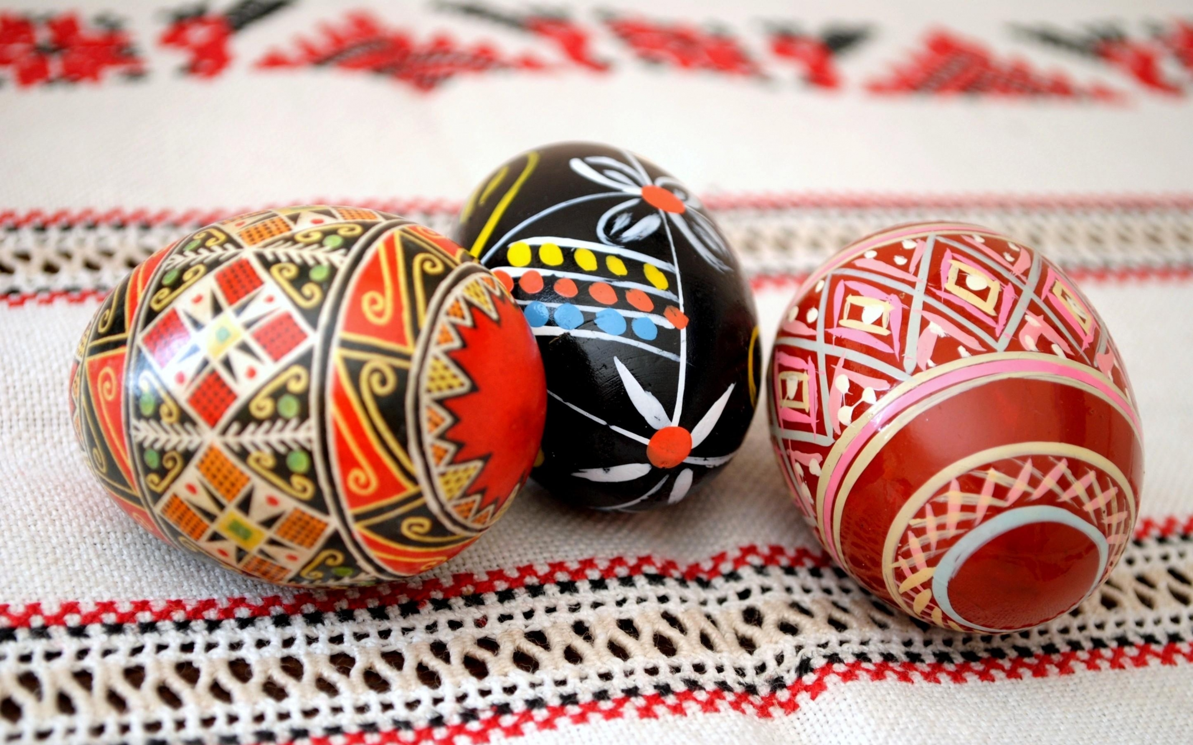 Белые и красные тюльпаны в корзине на столе с разноцветными яйцами на Пасху