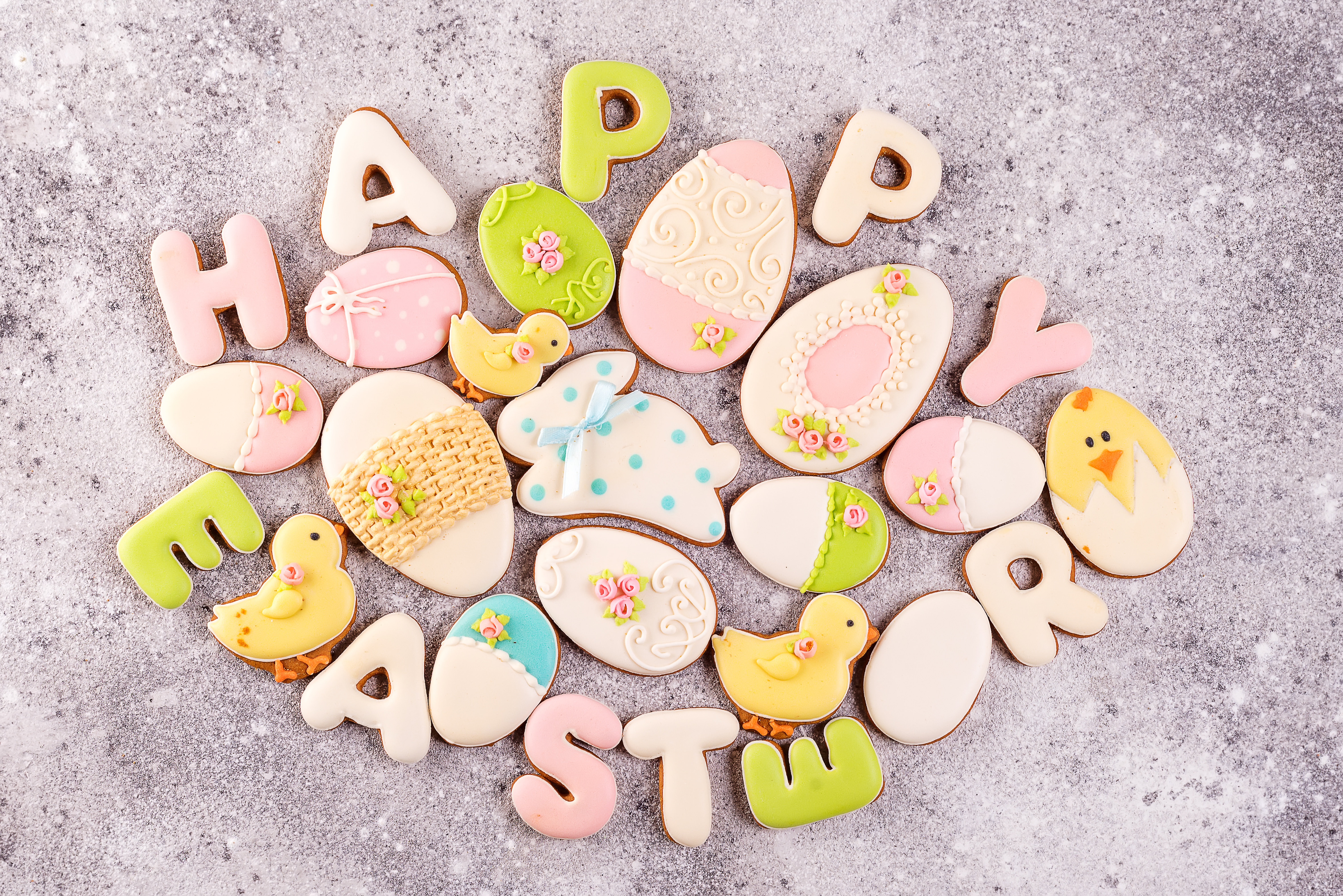 Печенье Счастливой Пасхи на сером столе - 6016x4016
