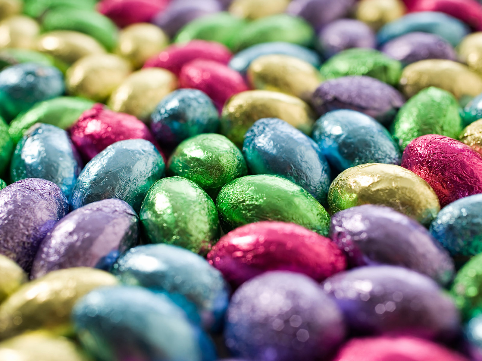 Белые и красные тюльпаны в корзине на столе с разноцветными яйцами на Пасху