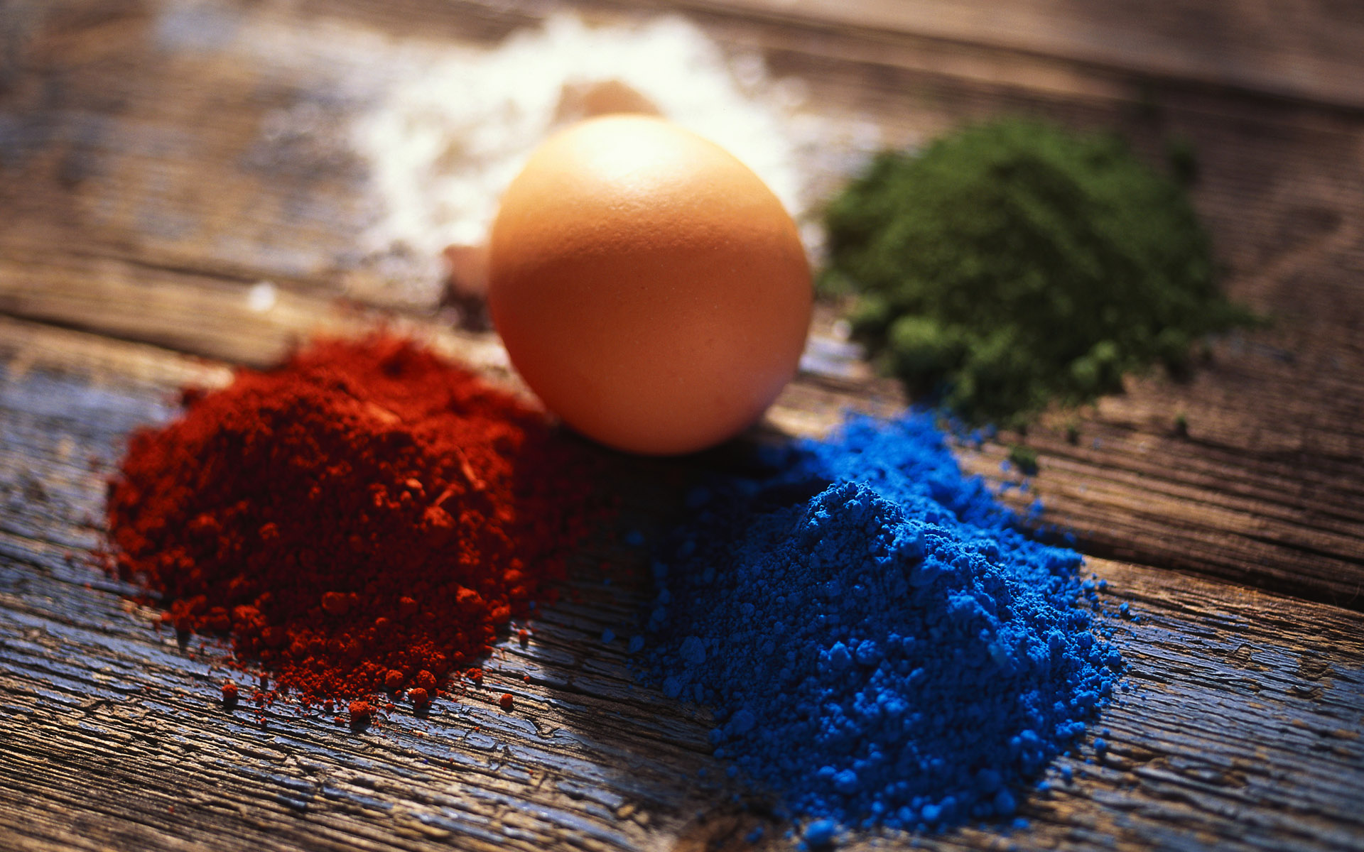 Белые и красные тюльпаны в корзине на столе с разноцветными яйцами на Пасху