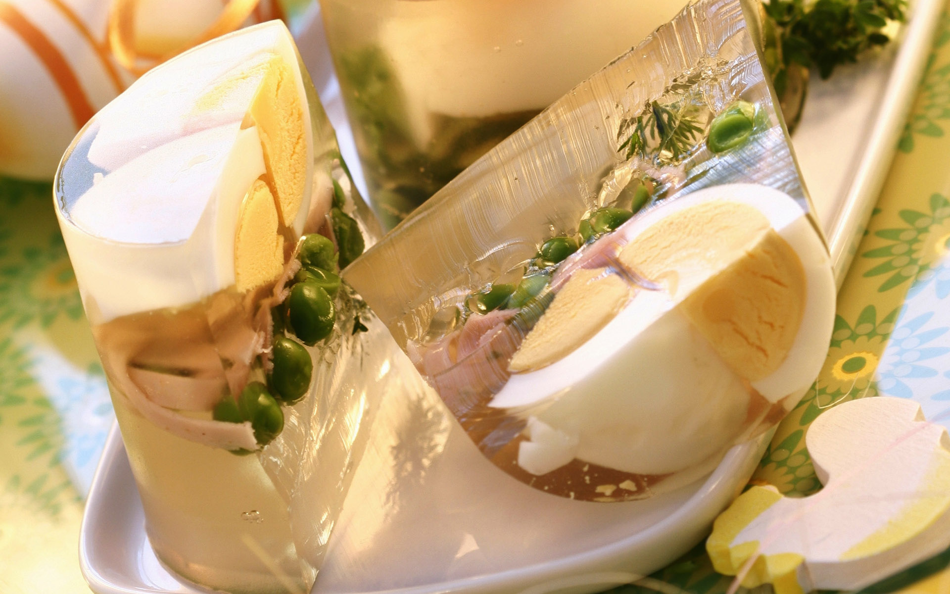 Белые и красные тюльпаны в корзине на столе с разноцветными яйцами на Пасху