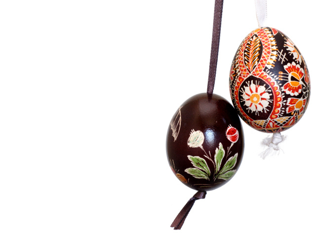 Белые и красные тюльпаны в корзине на столе с разноцветными яйцами на Пасху