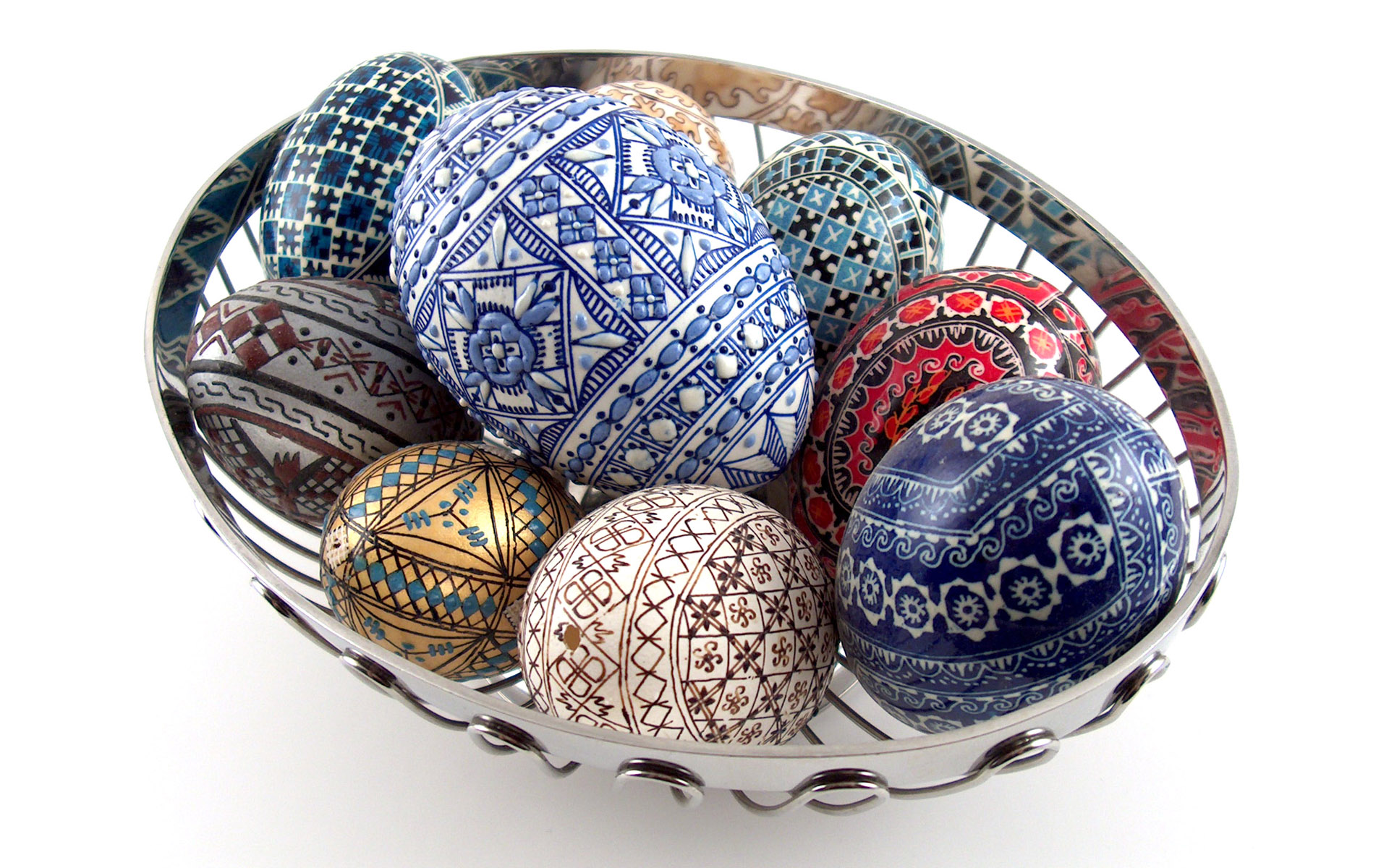 Белые и красные тюльпаны в корзине на столе с разноцветными яйцами на Пасху