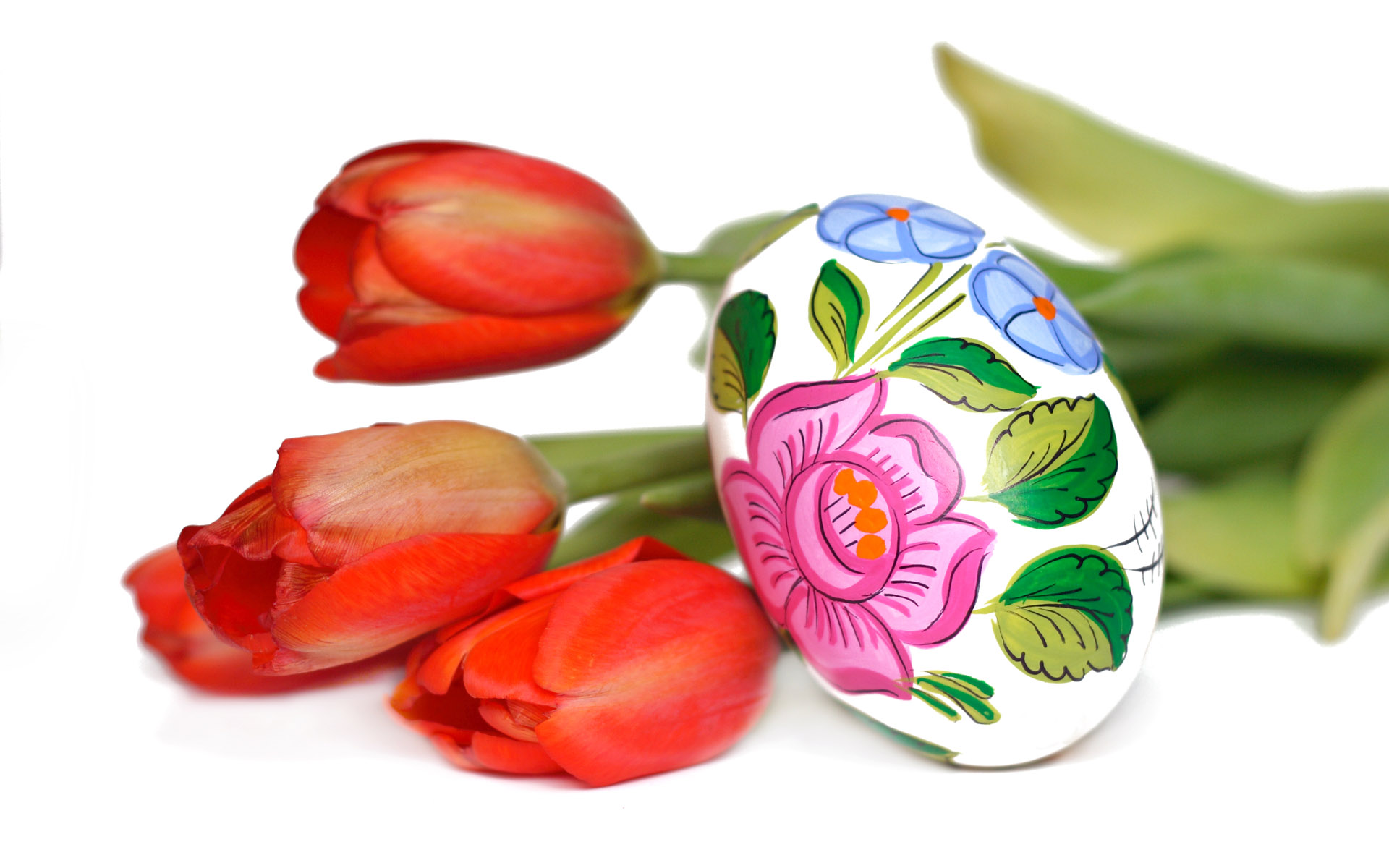 Белые и красные тюльпаны в корзине на столе с разноцветными яйцами на Пасху