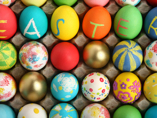 Белые и красные тюльпаны в корзине на столе с разноцветными яйцами на Пасху