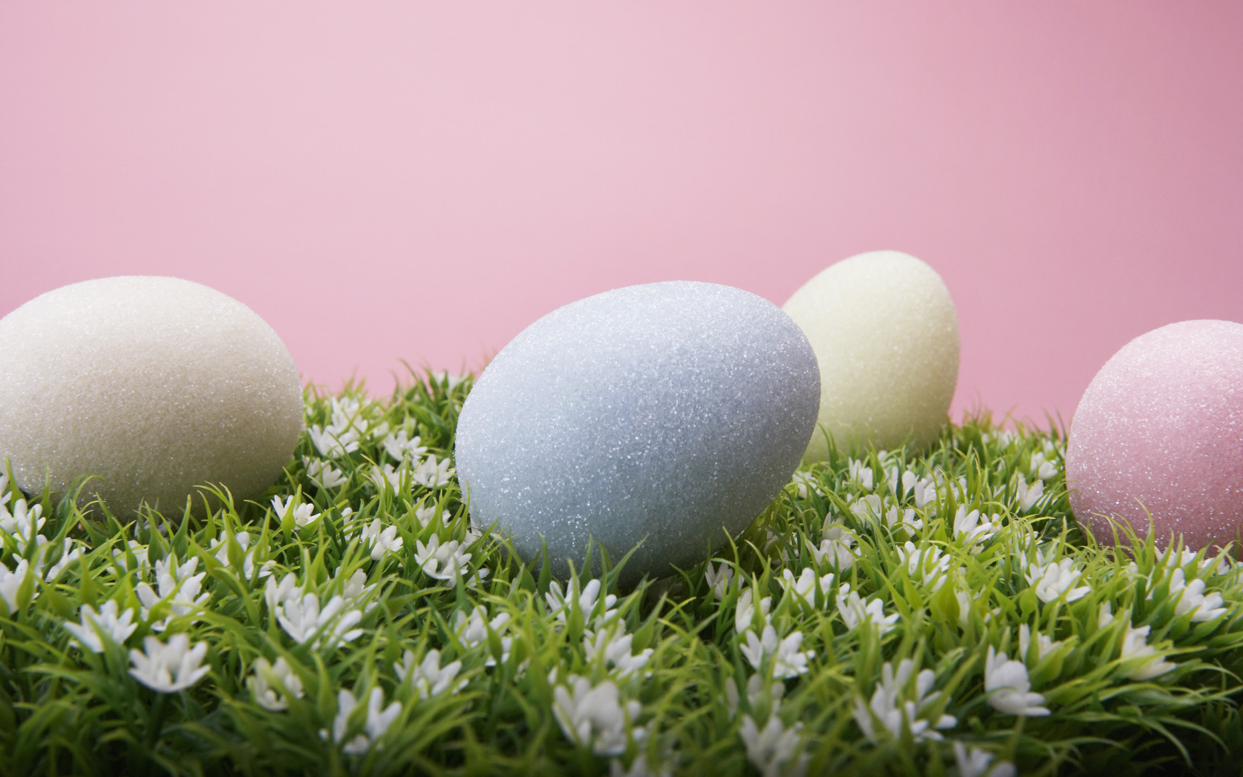 Белые и красные тюльпаны в корзине на столе с разноцветными яйцами на Пасху