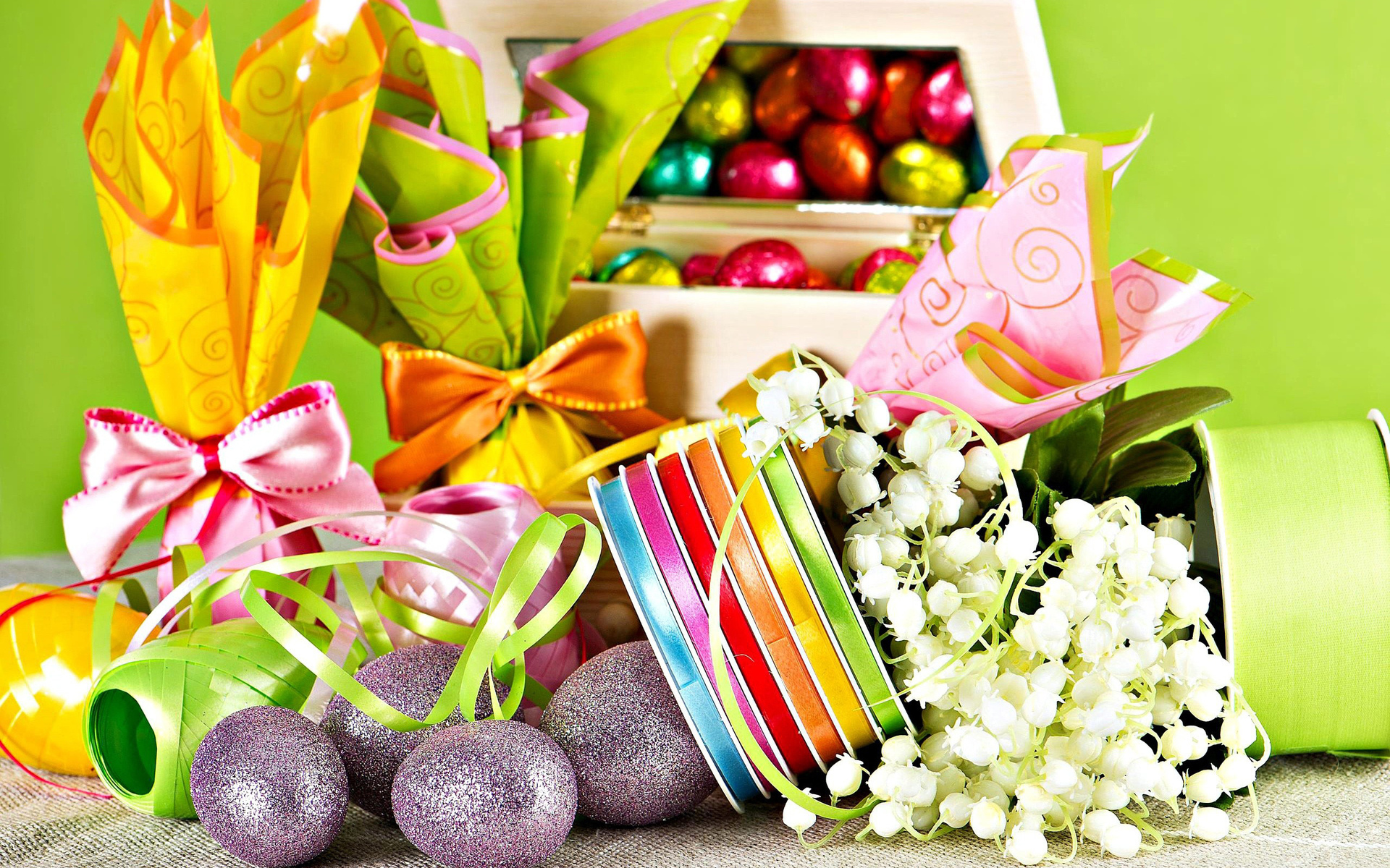 Белые и красные тюльпаны в корзине на столе с разноцветными яйцами на Пасху