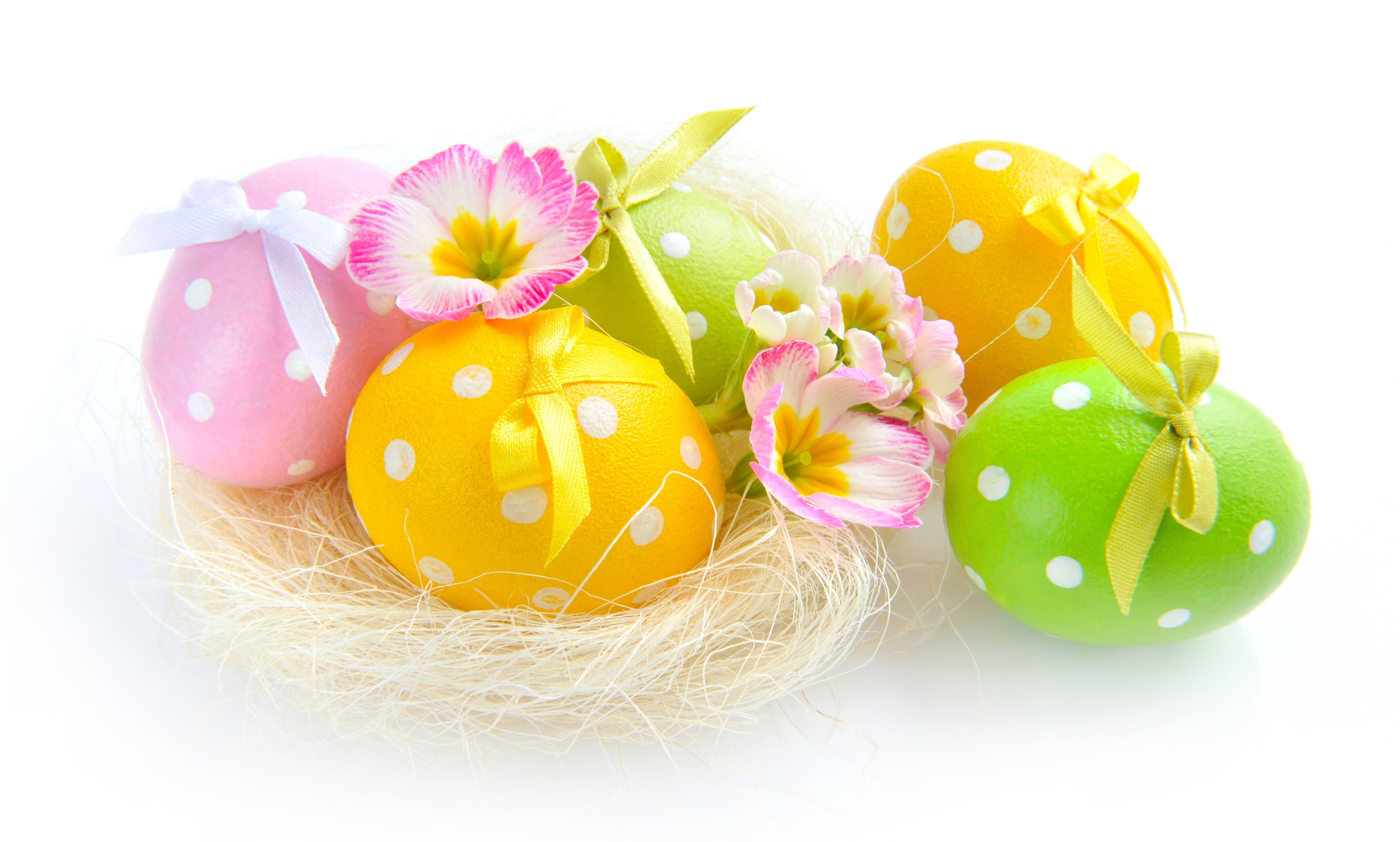 Белые и красные тюльпаны в корзине на столе с разноцветными яйцами на Пасху