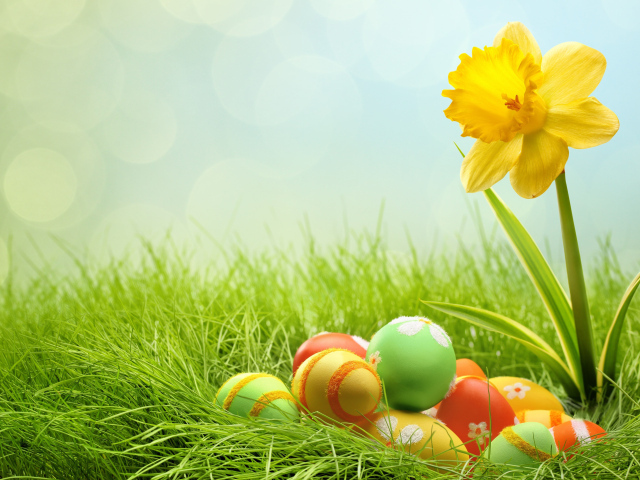 Белые и красные тюльпаны в корзине на столе с разноцветными яйцами на Пасху