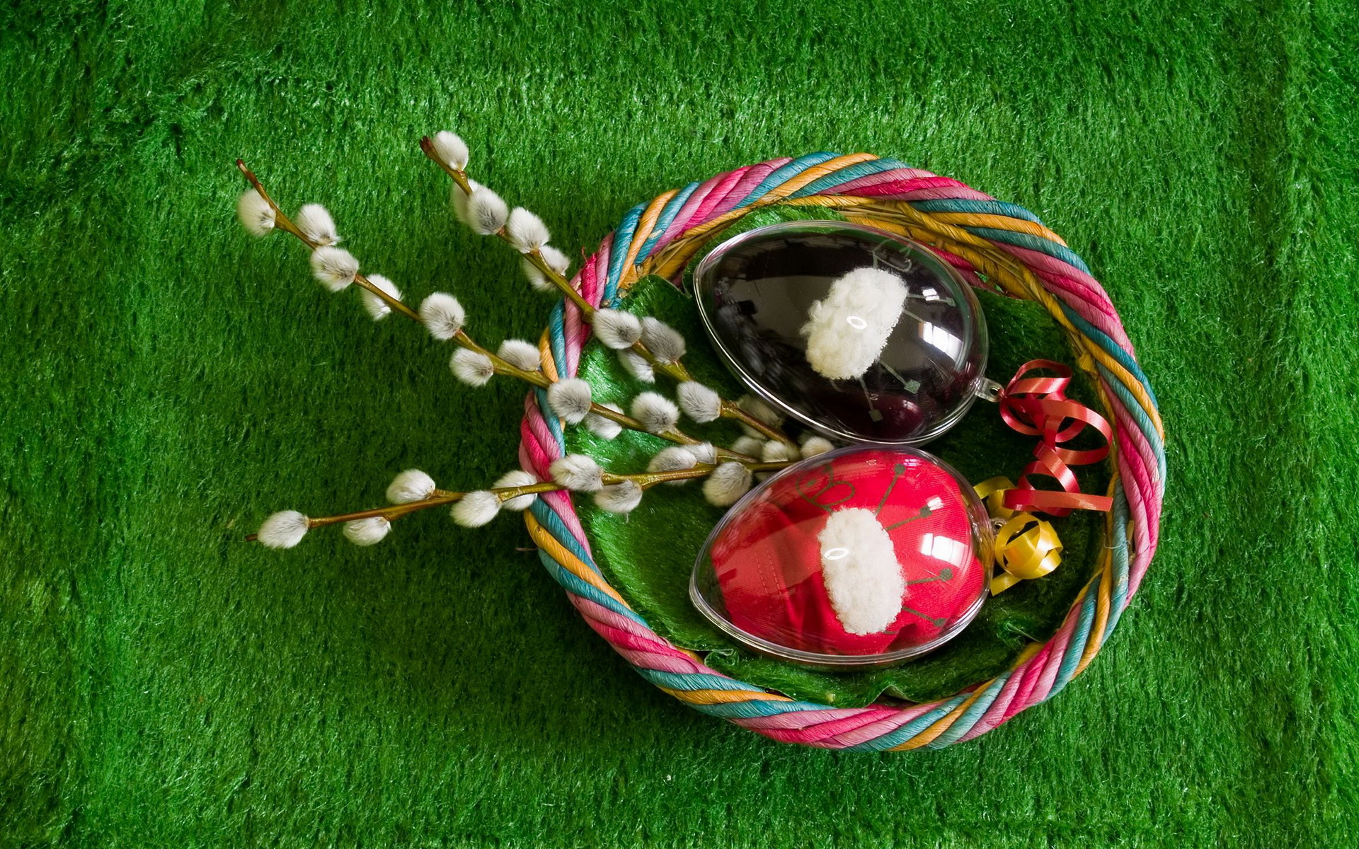 Белые и красные тюльпаны в корзине на столе с разноцветными яйцами на Пасху