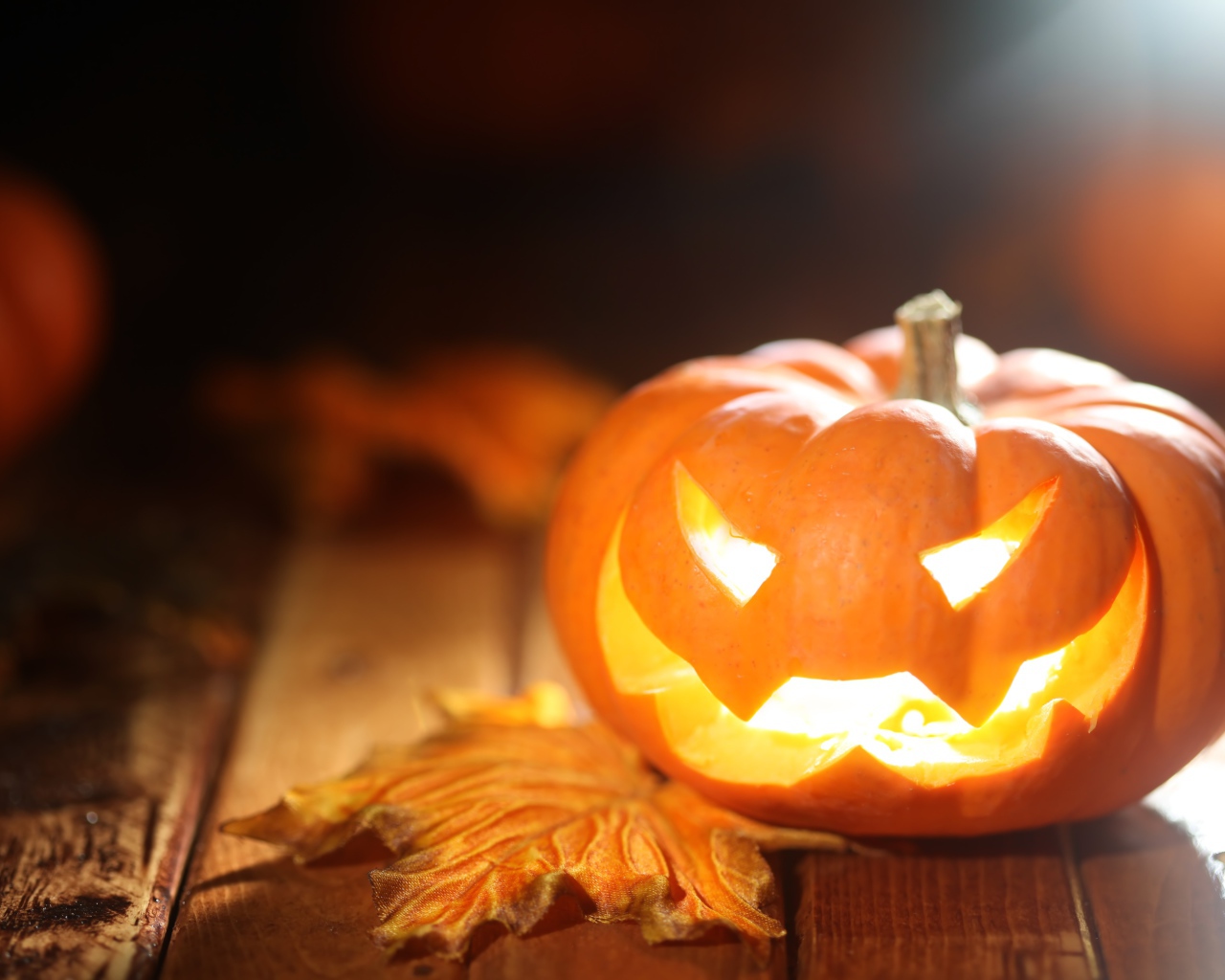 Светящаяся тыква на столе на Хэллоуин - 5616x3744