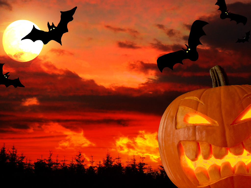 Страшная тыква и летучие мыши на фоне луны Обои для рабочего стола 1024x768